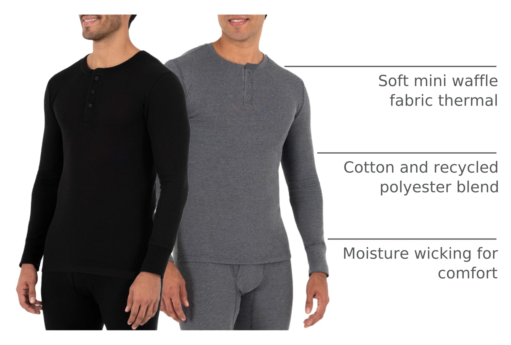 Description Stay warm and comfortable all season long in the Fruit of the Loom Menβs Recycled Waffle Thermal Underwear Henley Top. Crafted from a soft blend of U.S.-sourced cotton and recycled polyester, this eco-conscious top combines sustainability with everyday comfort. The mini waffle knit fabric naturally traps body heat to help retain warmth, while moisture-wicking technology keeps you dry during active or cold-weather wear. Designed for performance and comfort, this long sleeve henley features flat seams to reduce chafing, rib-knit cuffs to seal in heat, and a tag-free neck label for irritation-free wear. The fitted construction layers smoothly under jackets or sweaters without adding bulk, making it ideal for work, outdoor activities, or relaxing at home. Available in 1- and 2-pack options, this thermal henley top is a versatile, essential piece for your cold-weather wardrobe.