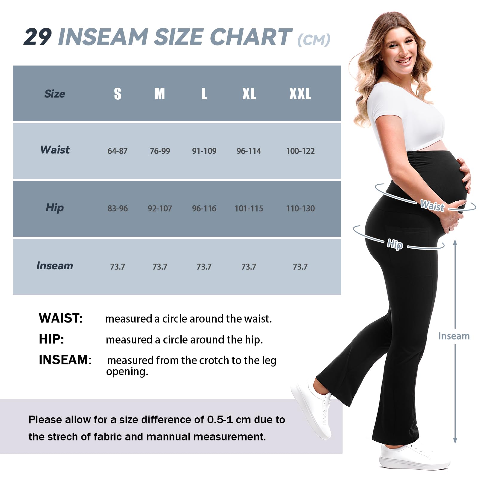 Flare and Pockets Design: Pregnancy also has the right to pursue fashion, the unique flare pattern can visually optimise the proportion of the legs, cover leg defects and enhance the sense of fashion and variety of wear. It is also equipped with two pockets for storing phones, keys and other belongings, allowing unrestricted movement
