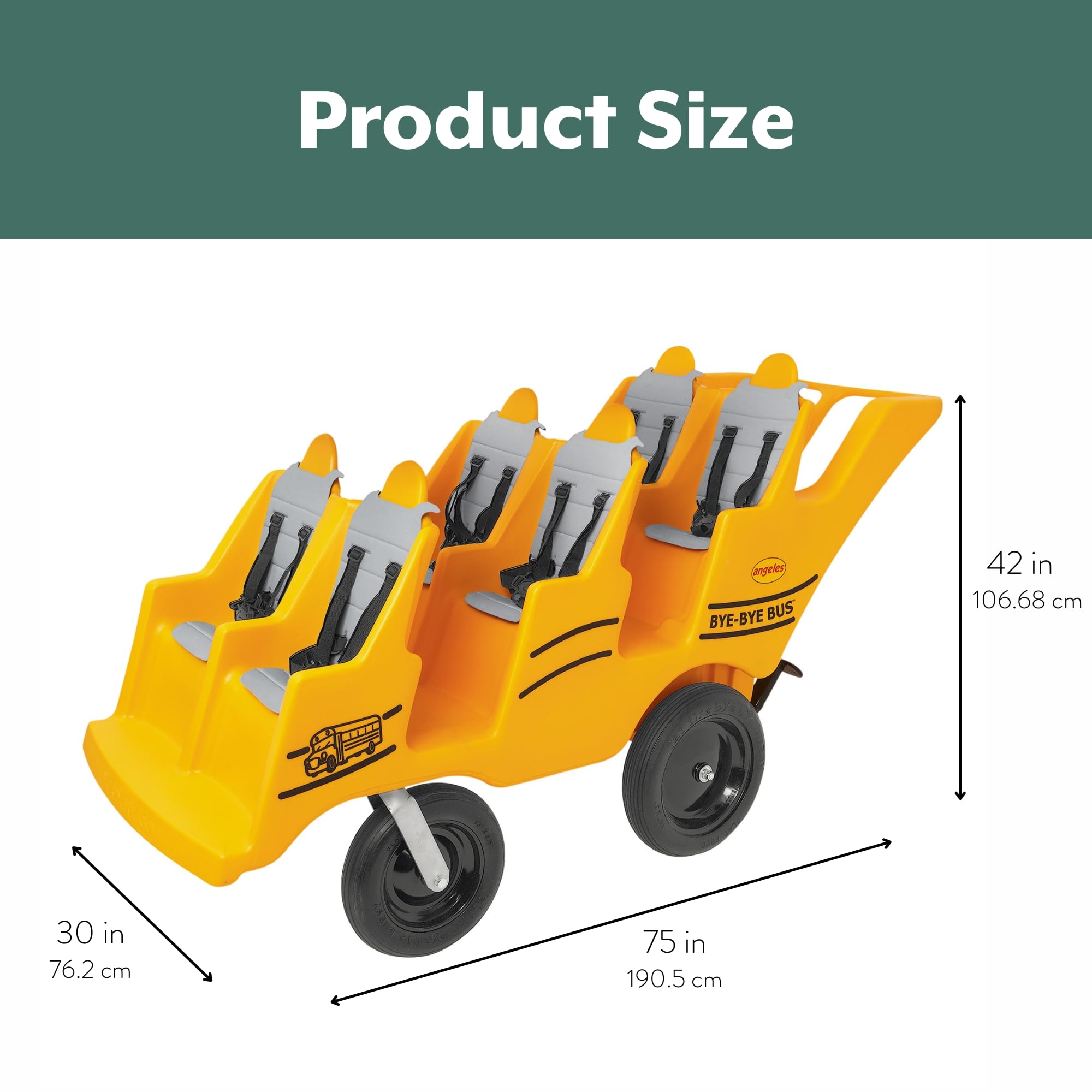 Children's Factory Angeles Bye-Bye Buggy: 6-Passenger Stroller for Daycare Daycare providers, this one's for you. The Angeles Bye-Bye Buggy is a multi-passenger stroller designed to make transporting young children easier and safer. This spacious buggy comfortably fits up to 6 children, each weighing up to 40 pounds. No more struggling with multiple single strollers, the Bye-Bye Buggy keeps everyone together for smoother outings. Each seat features replaceable, 5-point harnesses that are easy to fasten and keep kids securely buckled in during rides. Forget about flat tires! The Bye-Bye Buggy boasts special "fat tires" that are puncture-proof. Whether you're strolling on pavement, grass, or uneven ground, these tires ensure a comfortable ride for both you and the children. The 360-degree swiveling front wheels allow for tight turns and easy navigation through narrow hallways or crowded playgrounds. The sturdy, one-piece molded frame of the Bye-Bye Buggy is built to last, providing a secure and comfortable environment for your little passengers. A parking brake keeps the buggy secure when stopped, giving you peace of mind. The Bye-Bye Buggy is designed to fit through standard doorways, allowing for easy movement between rooms or outdoor adventures. Canopies are sold separately and a separate seat is required for children under 6 months old.