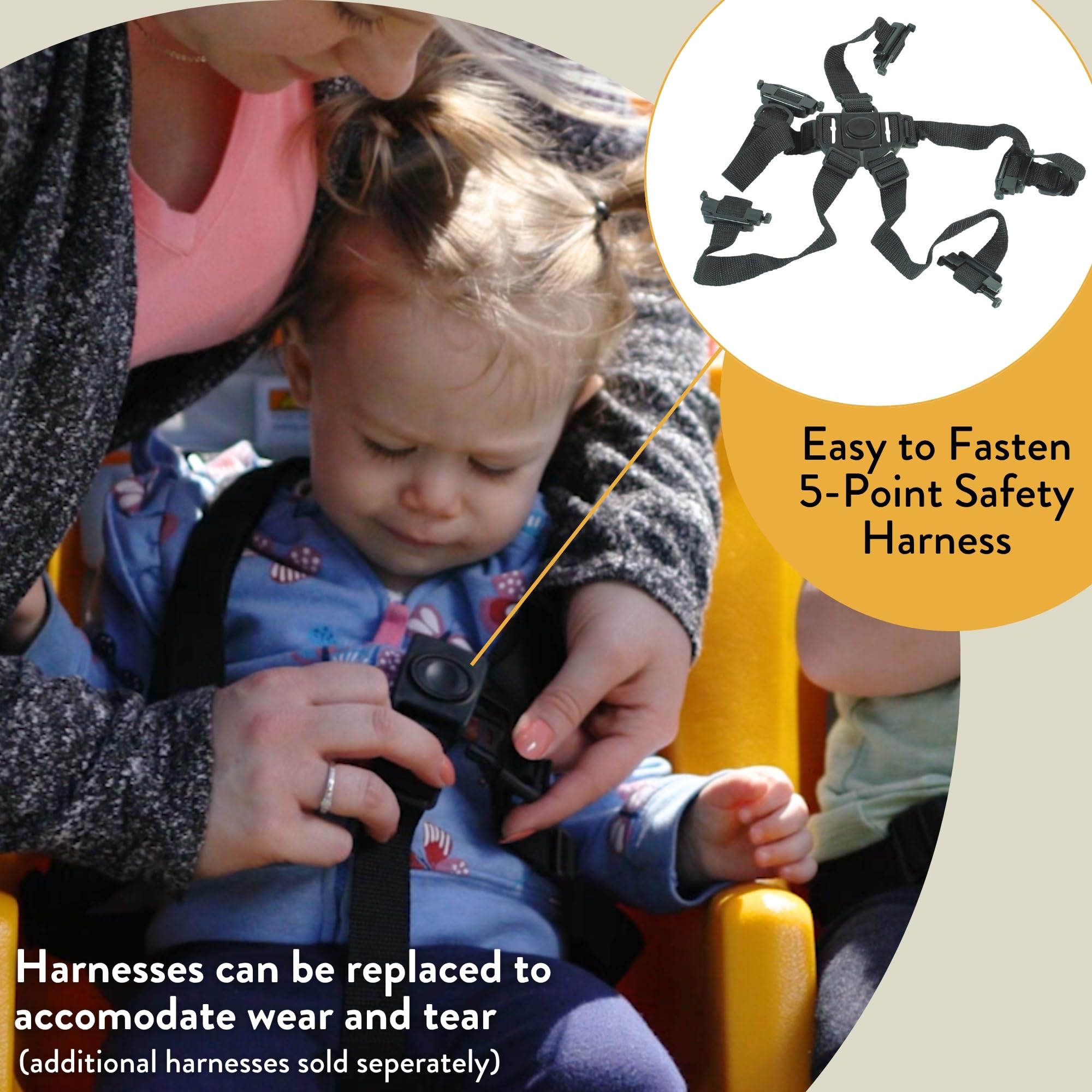 SAFETY BUCKLES: Our replaceable, easy-to-fasten, five-point harness makes buckling each child a breeze. Seats accommodates children up to 40 lbs. each. An infant seat is required for children under 6 months. (Infant seats sold separately.)