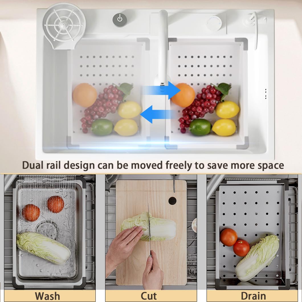【Multi-functional Area】Featuring a dual-layer sliding design that can be moved left or right, equipped with a movable basin, draining basket, and cutting board. Easily achieve partitioned operations by flexibly moving these accessories, making tasks like chopping, thawing, and washing a breeze.