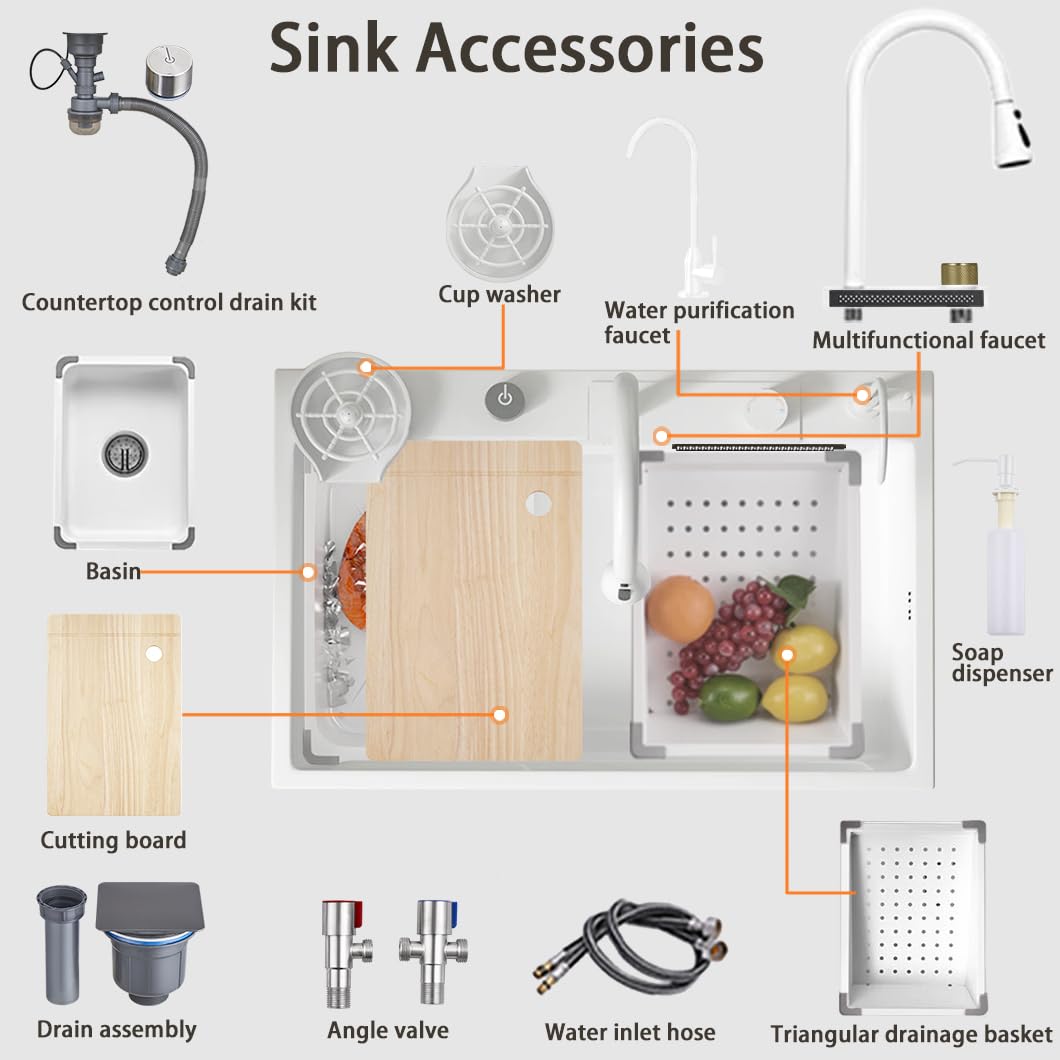 【The package includes】Nano Sink, Water Drainer Set, Flying rain pull-out faucet, Basin, Triangular Drain basket, Water Purification Faucet, Cup Washer, Cutting Board, Angle valve, Water Inlet Pipe. This accessory set is tailored for your daily needs. We take responsibility for the quality of the sink. If you have any questions, feel to contact us!