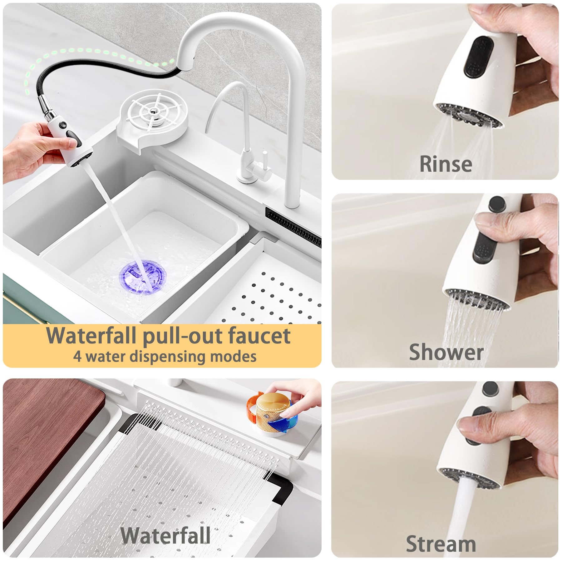 【Unique Faucet Design】The waterfall kitchen sink comes with a dedicated pull-out faucet, allowing easy operation within a flexible range of 60 cm extension. Four cleaning modes (stream, spray, rinse, waterfall) cater to various water usage needs. A knob switches between faucet and waterfall modes, ensuring simple and convenient operation.