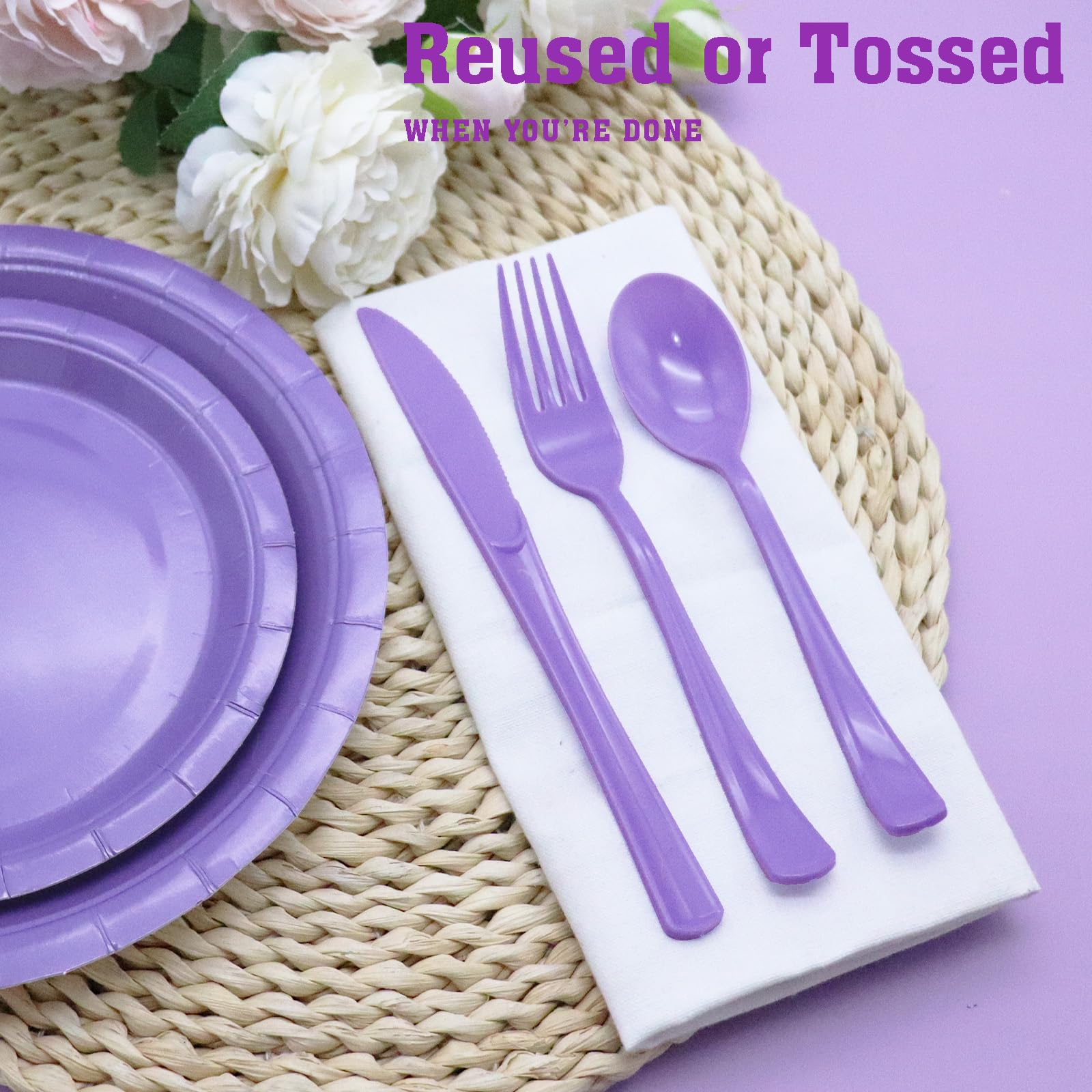 【Convenient and Reusable】:The lavender plastic silverware is disposable, saving time and energy for cleaning up after the party, more convenient and quicker, perfect for the fast-paced modern lifestyle. Of course, if you want to continue using the plastic silverware, simply wash it in soapy water to restore its lustre and get it ready for your next party.