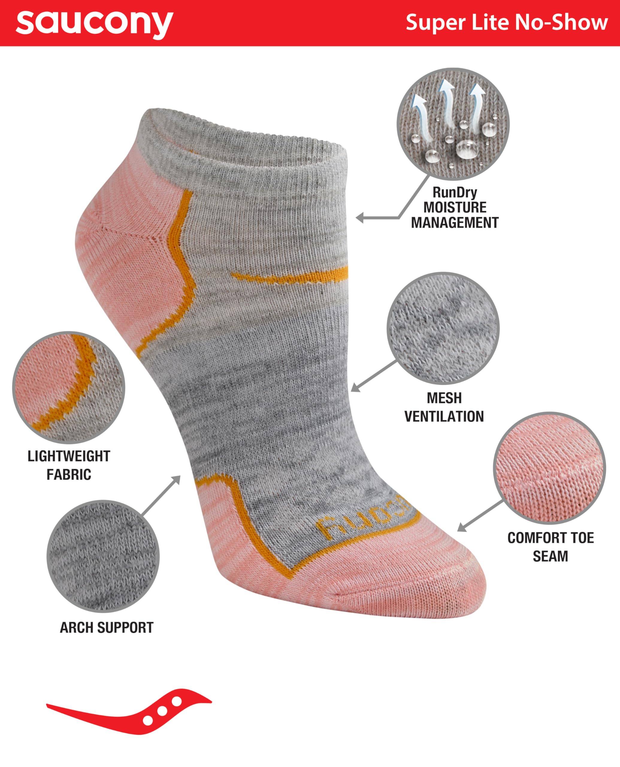 Description Saucony women's performance super lite no show socks is a perfect combination of comfort and support. Great for the toughest training sessions. Features arch support and air mesh venting for lasting comfort. Run for Good - Saucony was founded way back in 1898. Ever since, we have been loyal to the sport, building goodness into every product and inviting millions around the world to run with us. At Saucony, we exist for runners, Runners inspire us, bringing us new idea, force us to be better, they drive our design and engineering. They keep us competitive. They keep us hungry. They keep us honest. This focus and passion fuels us as we strive to create the best running shoes and apparel on the planet. We leave work each day knowing we’ve done everything to make runners live just a little better.