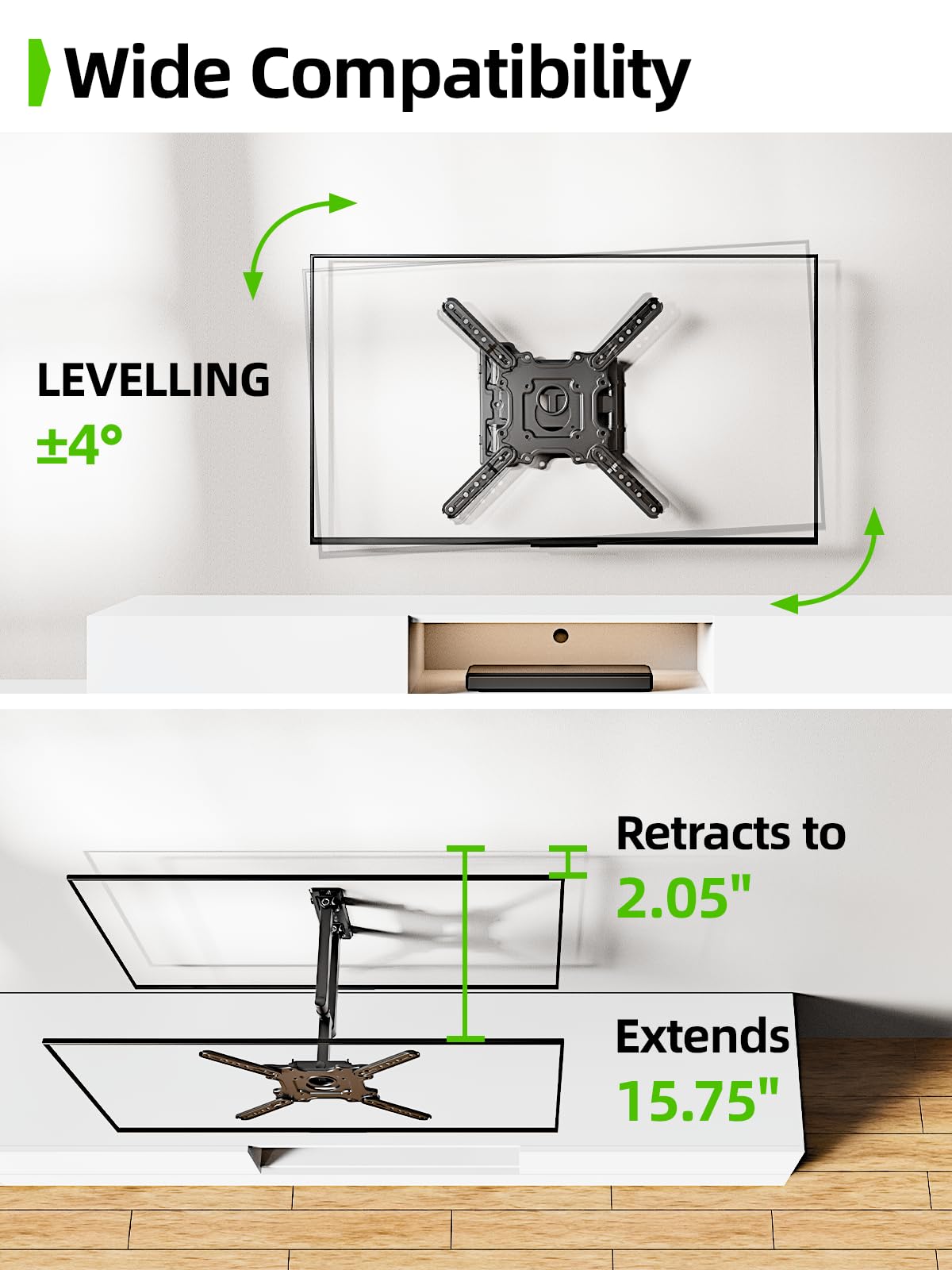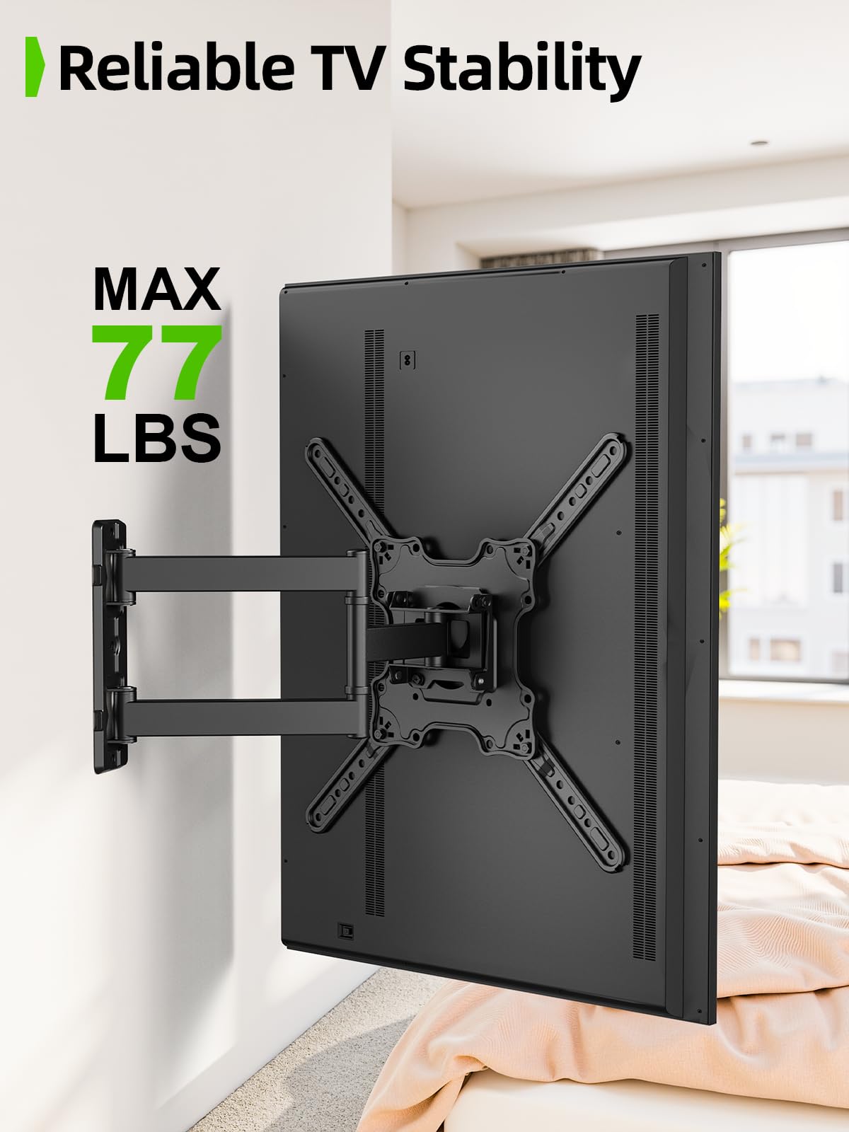 TV Wall Mount Compatibility: TV Mount 55 inch is designed for most 26-60" flat/curved TVs, supporting up to 77lbs (35kg) with VESA compatibility from 100x100mm to 400x400mm pattern. Engineered with reinforced steel arms and robot-welded joints, this Wall Mount TV Bracket undergoes rigorous testing to safely support your TV.