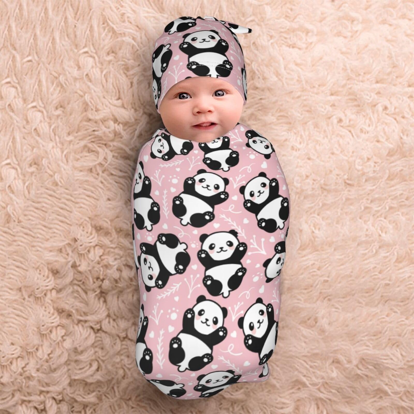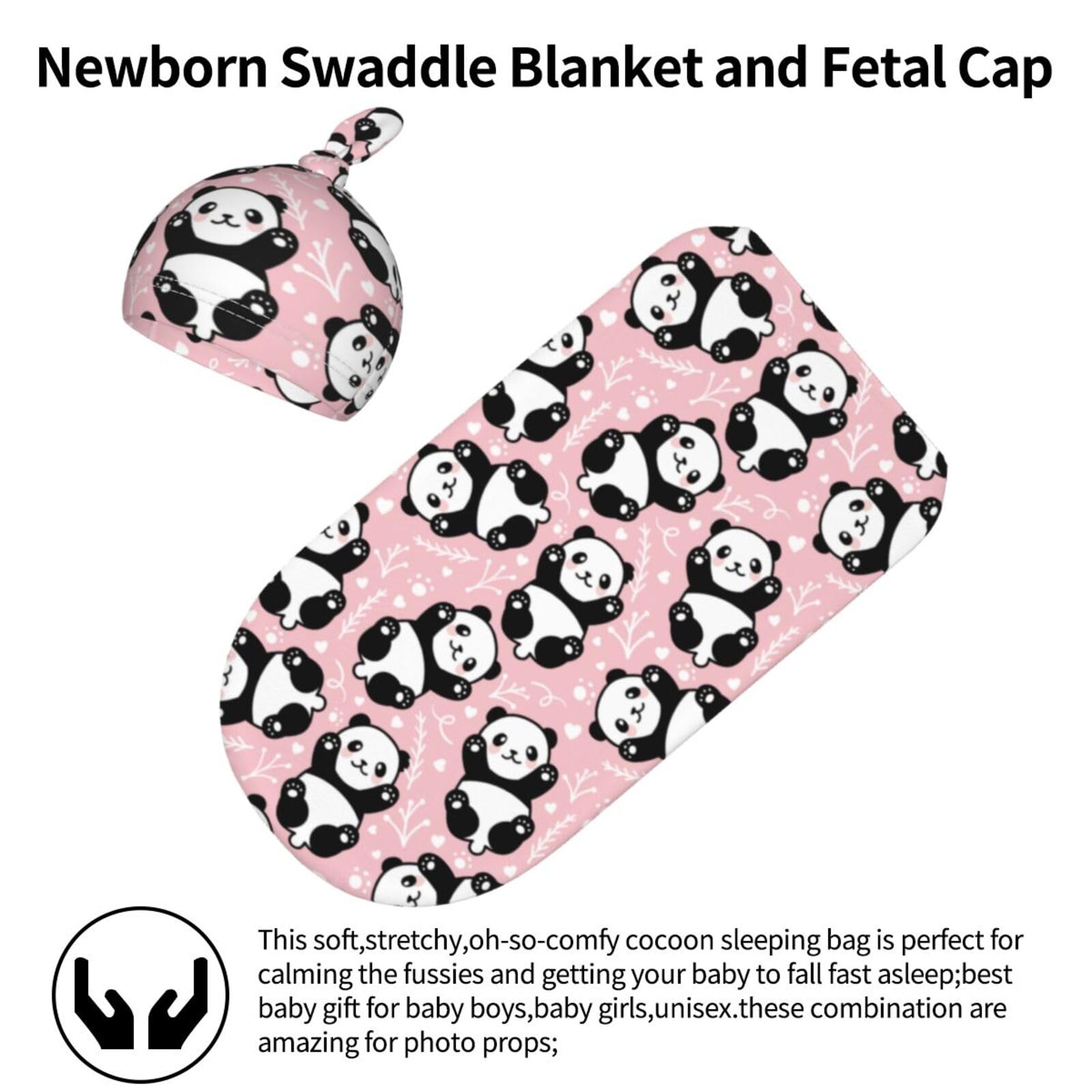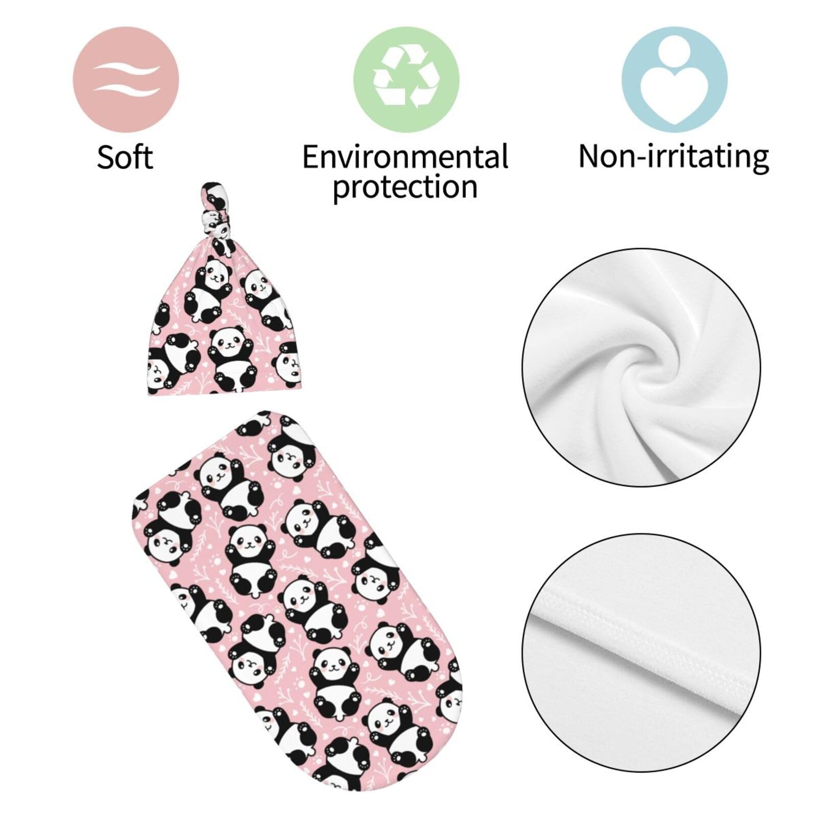 Panda Swaddle blanket is 20.8"x11.4"inch, hat is 13"x6.5"inch. is made of polyester, The Fabric Is Soft And Elastic, Comfortable.The hat is an adjustable knot on the top, which can be tightened or loosened as needed to ensure comfortable wear for newborns.