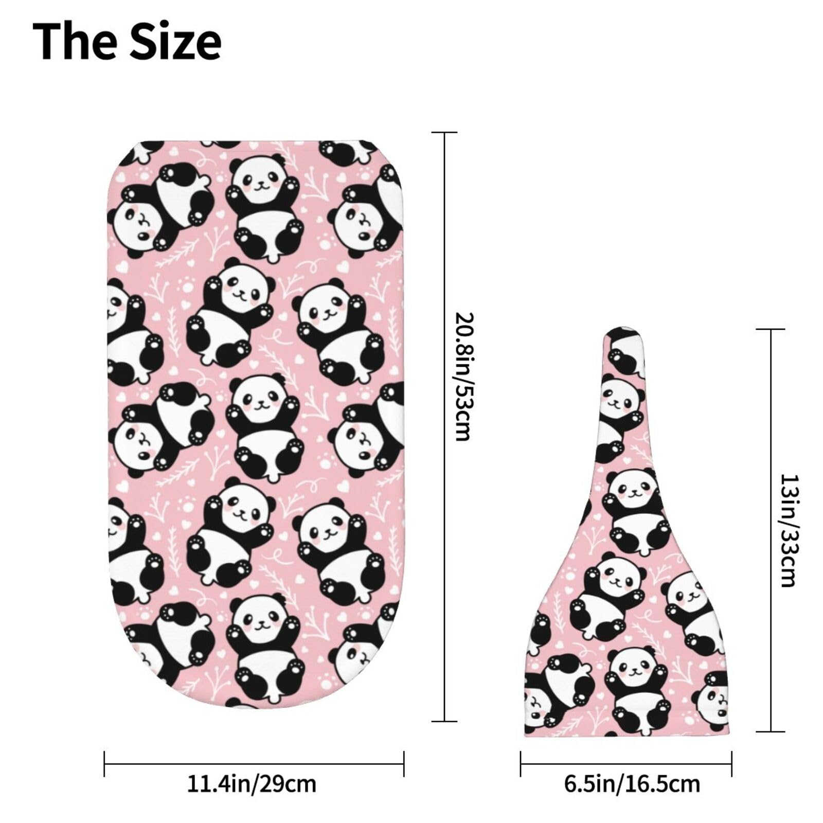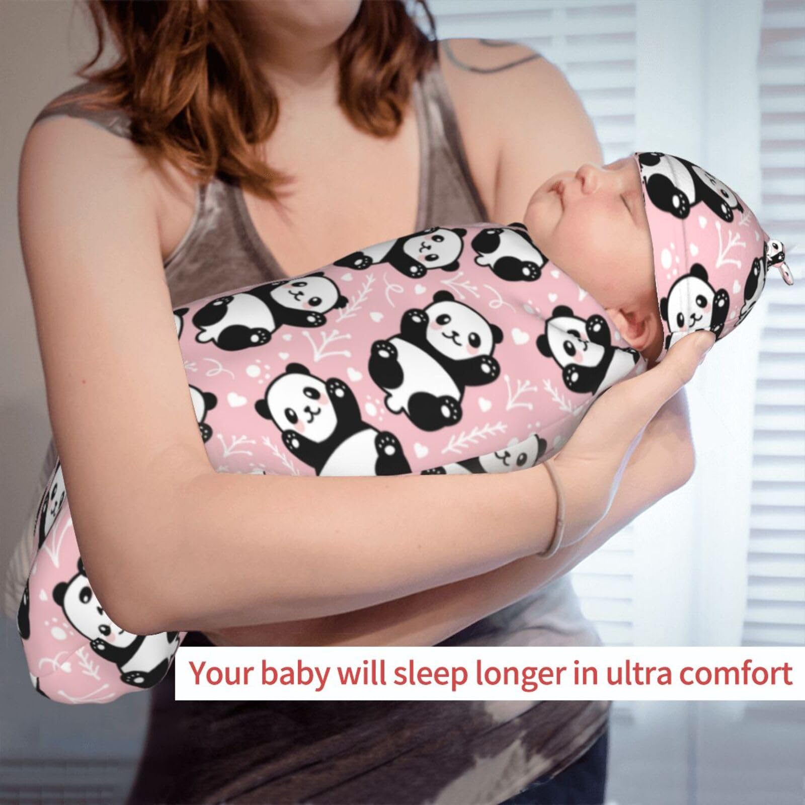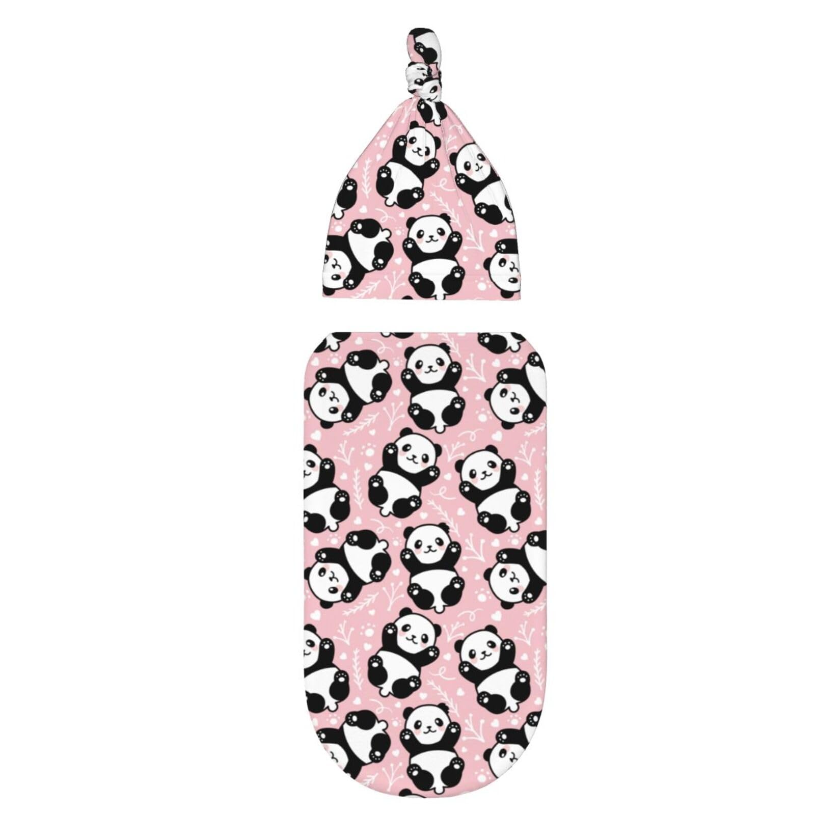 Panda Swaddle blanket is 20.8"x11.4"inch, hat is 13"x6.5"inch. is made of polyester, The Fabric Is Soft And Elastic, Comfortable.The hat is an adjustable knot on the top, which can be tightened or loosened as needed to ensure comfortable wear for newborns.