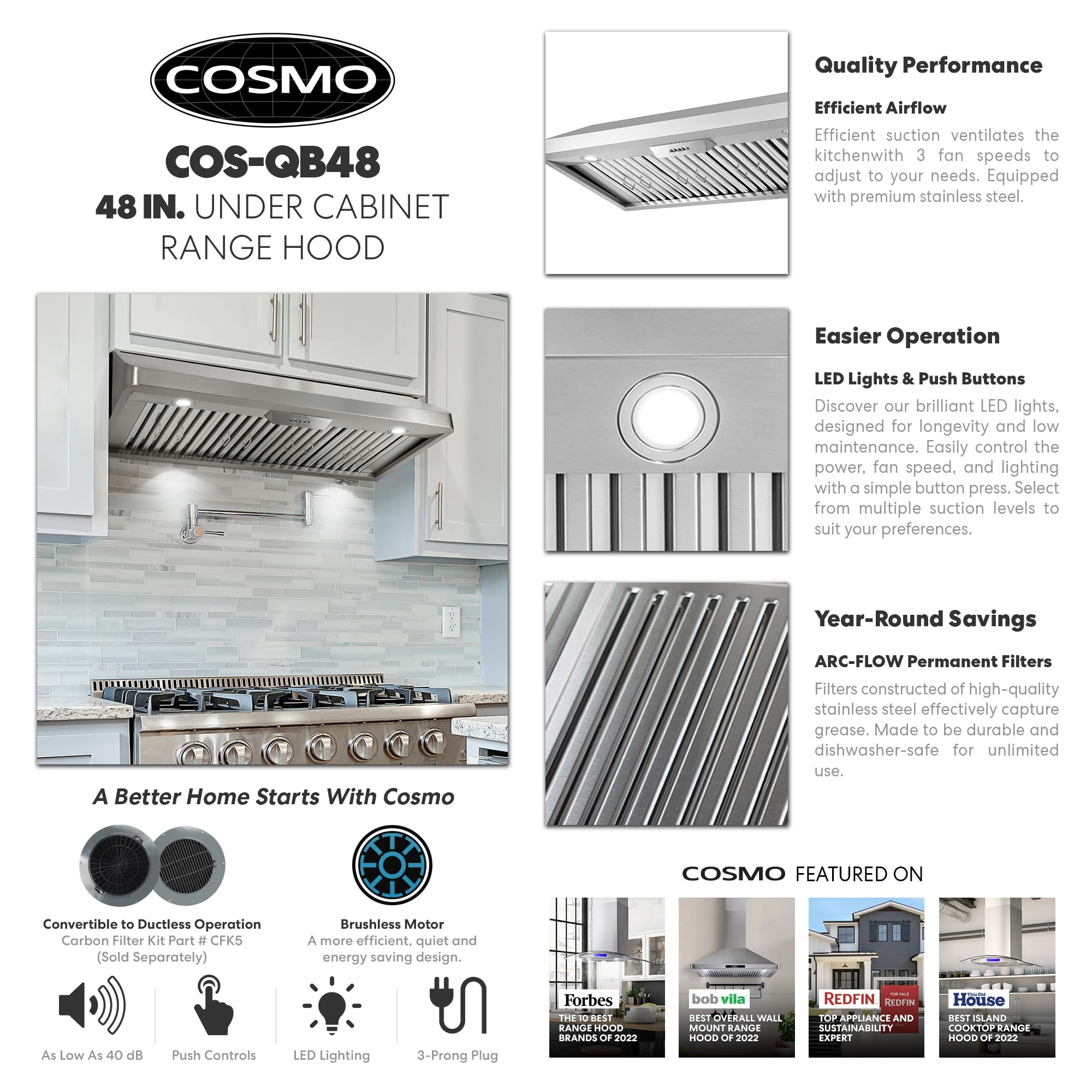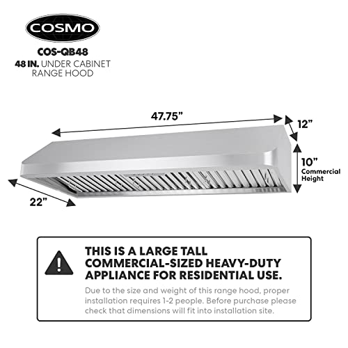 Cosmo’s COS-QB48 is the perfect choice for larger kitchens. At 48 inches, this under cabinet range hood is wide enough to handle large ranges with several burners. Housed in premium brushed stainless steel with seamless corners, this under cabinet range hood withstands high temperatures while maintaining a slim space-saving profile. Dual motors create 500 CFM of suction for efficient airflow and airborne grease and particle removal. Easy-to-use push button controls operate the 3-speed fan and bright white energy-efficient LEDs. Includes a 3-prong 120V power cord for easy installation. Part of the Haven Collection bringing enhanced functionality and design, offering a well-rounded option for those looking for more convenience and style in an appliance.
