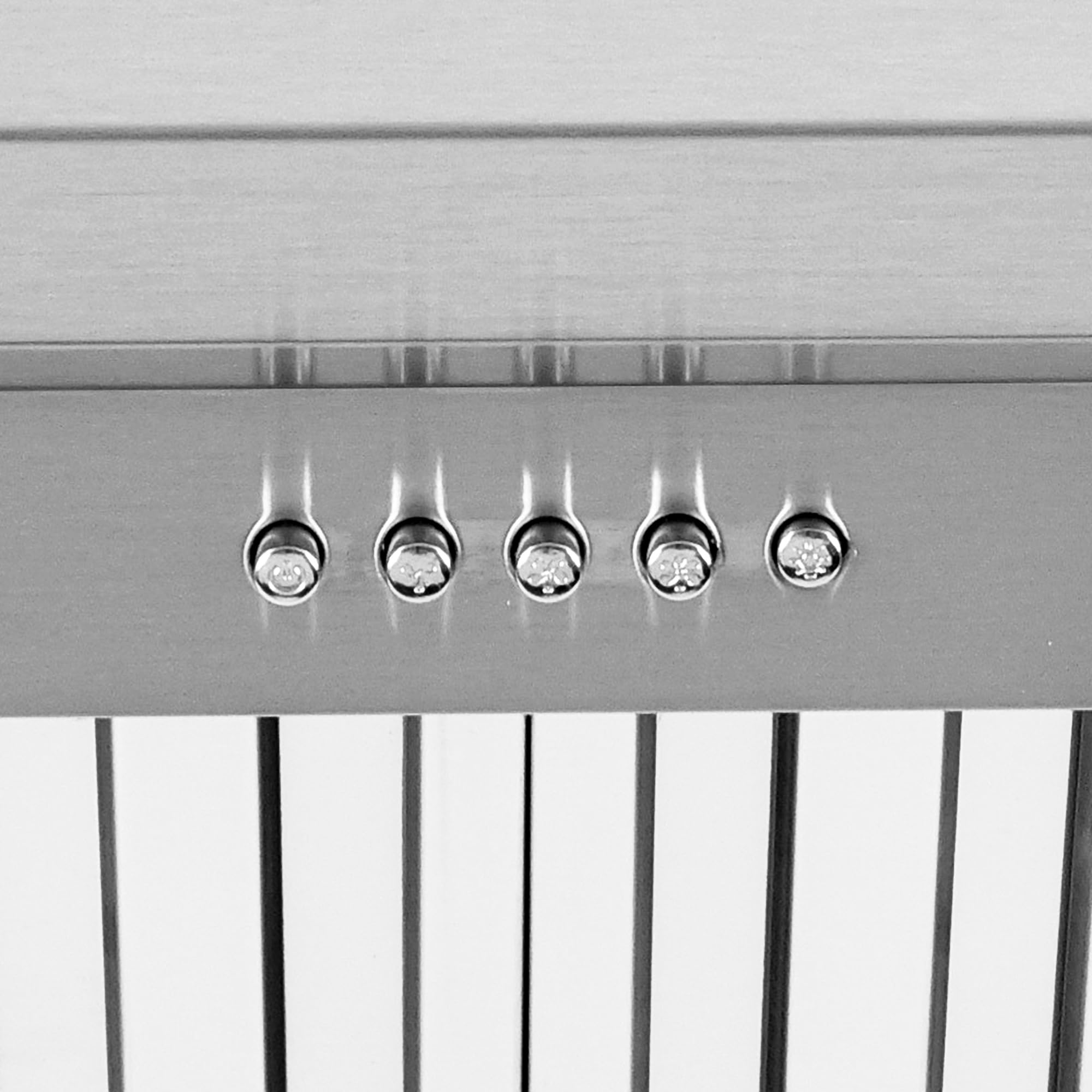 PUSH BUTTON CONTROLS: Range hood equipped with push button control panel to manage multiple functions, including fan speed, lights and power