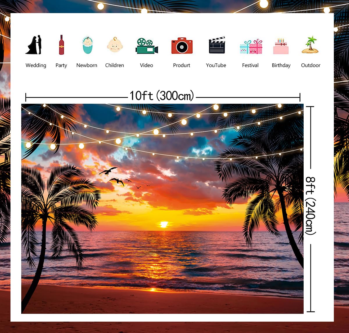 【Size】: Our hawaii sunset beach themed backdrop is measuring approximately 10 x 8 ft (3.0 x 2.4 m); This backdrop is perfect for creating hawaiian party and summer party decorations kit; Add a special sense of ceremony to the upcoming holiday