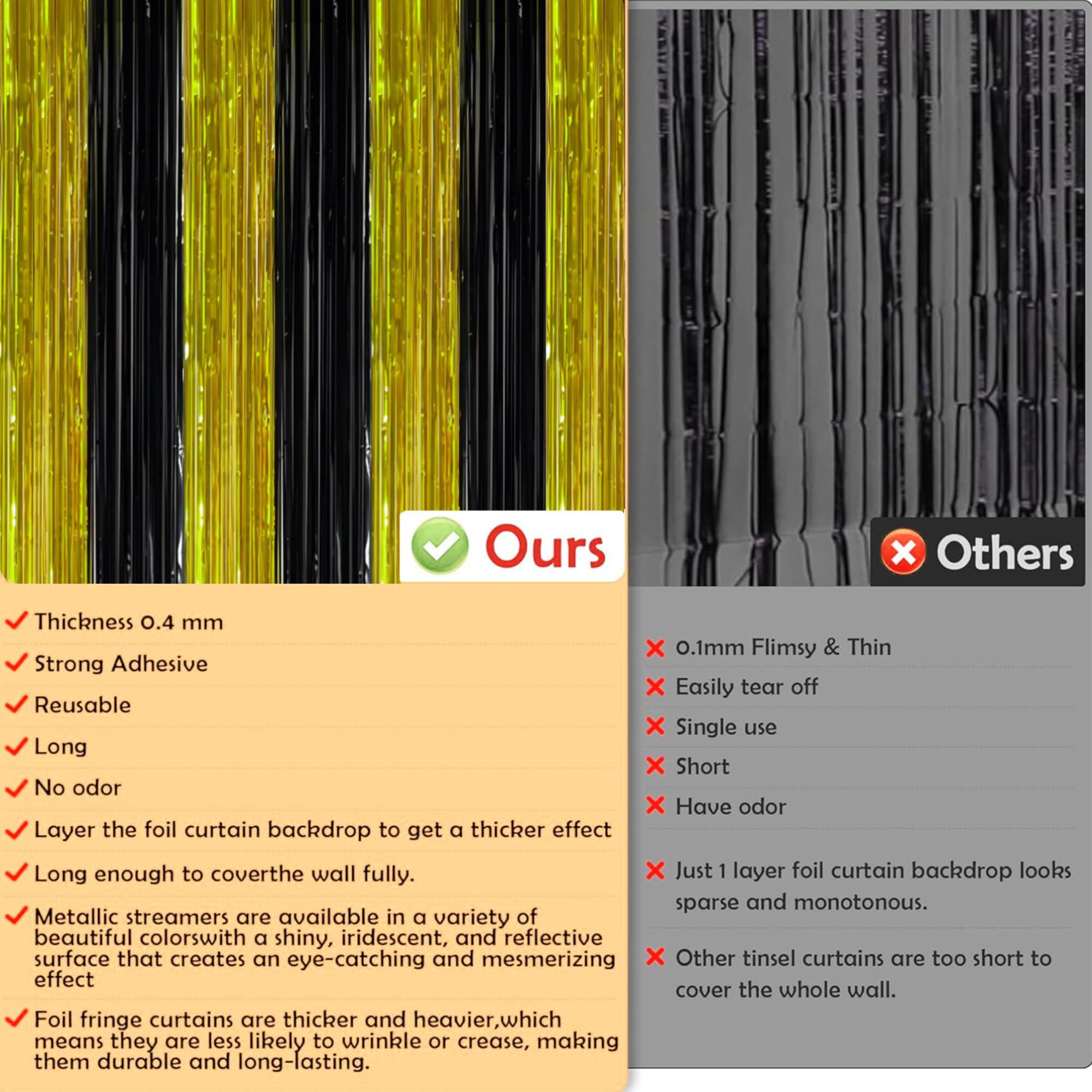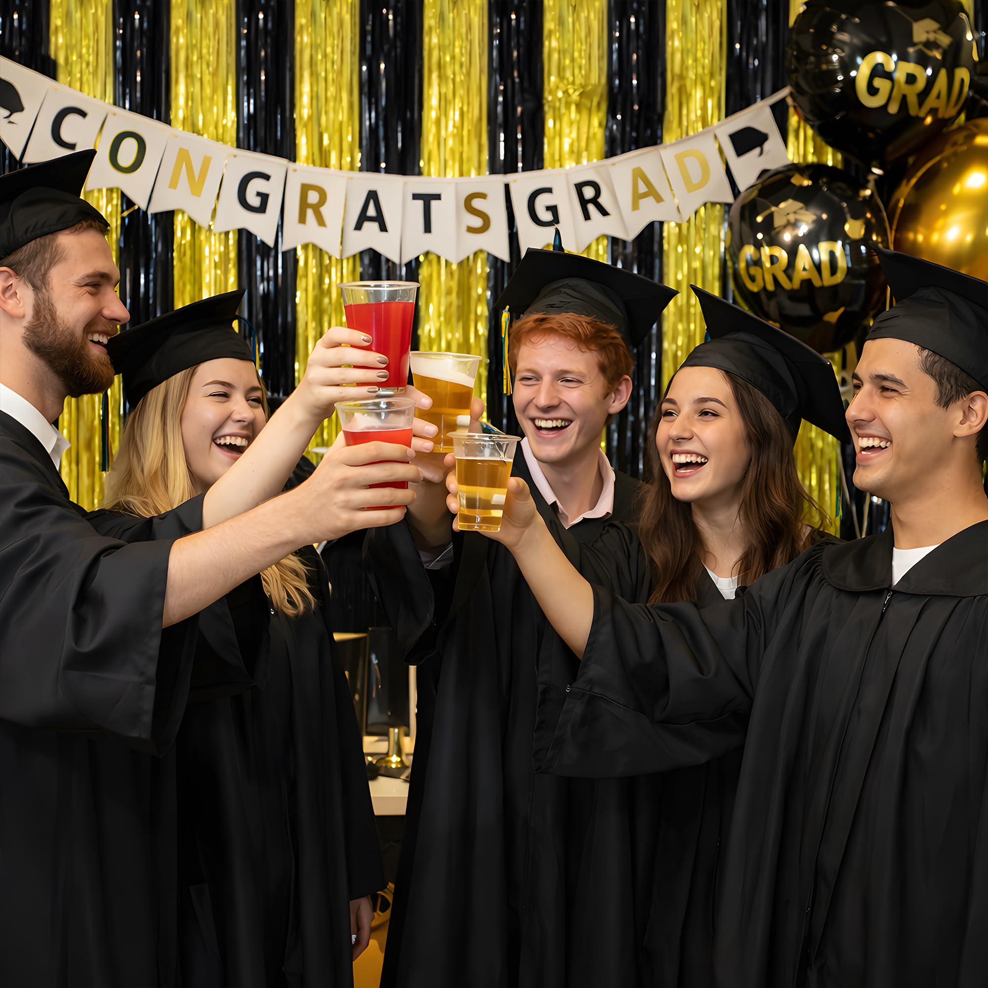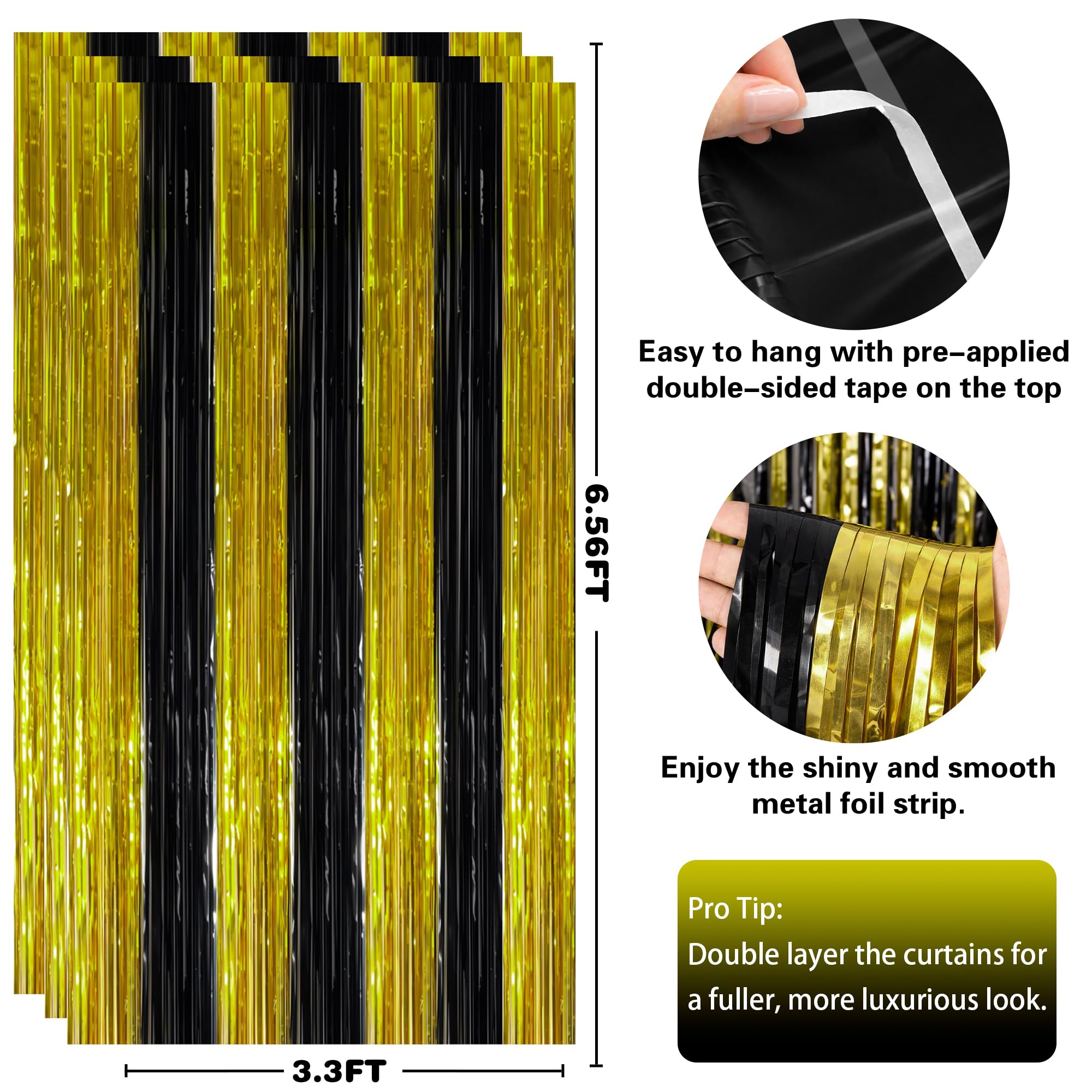 Graduation Party Decorations: The shimmering black and gold foil strands reflect light beautifully, instantly elevating your décor. Pair with balloons, LED lights, banners, tablecloths, or photo props to create a glamorous and unforgettable celebration.