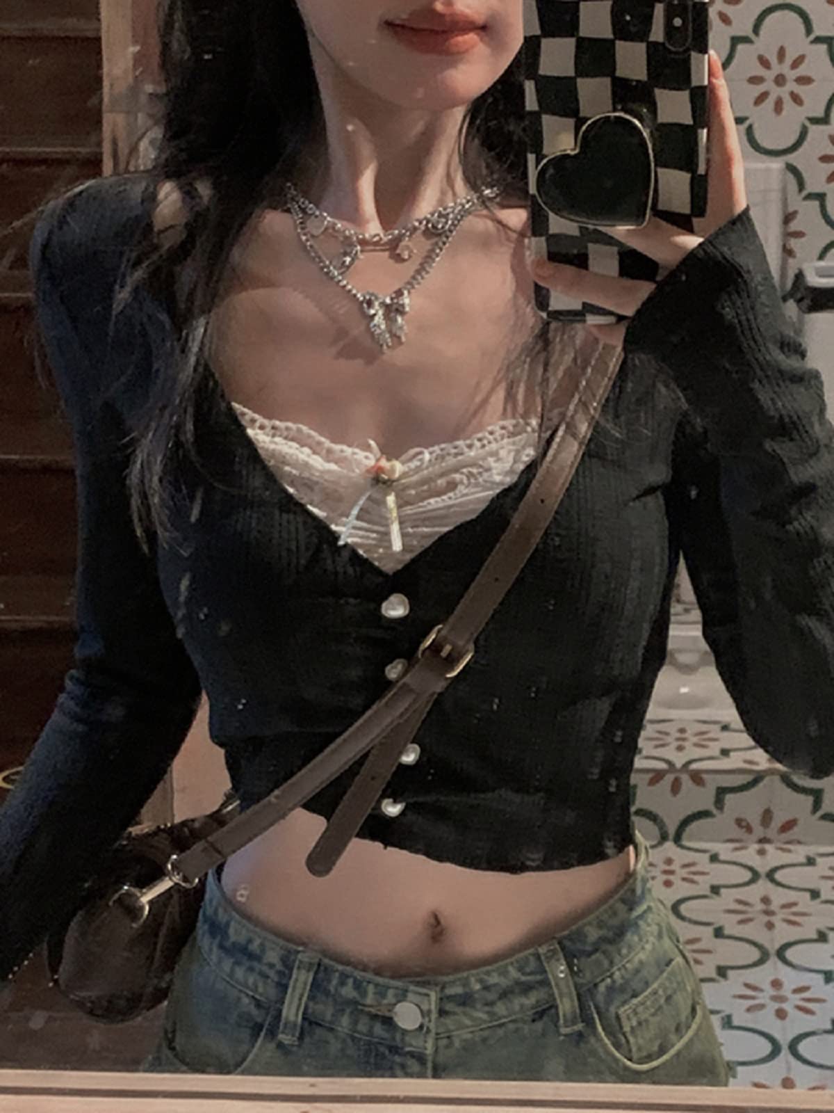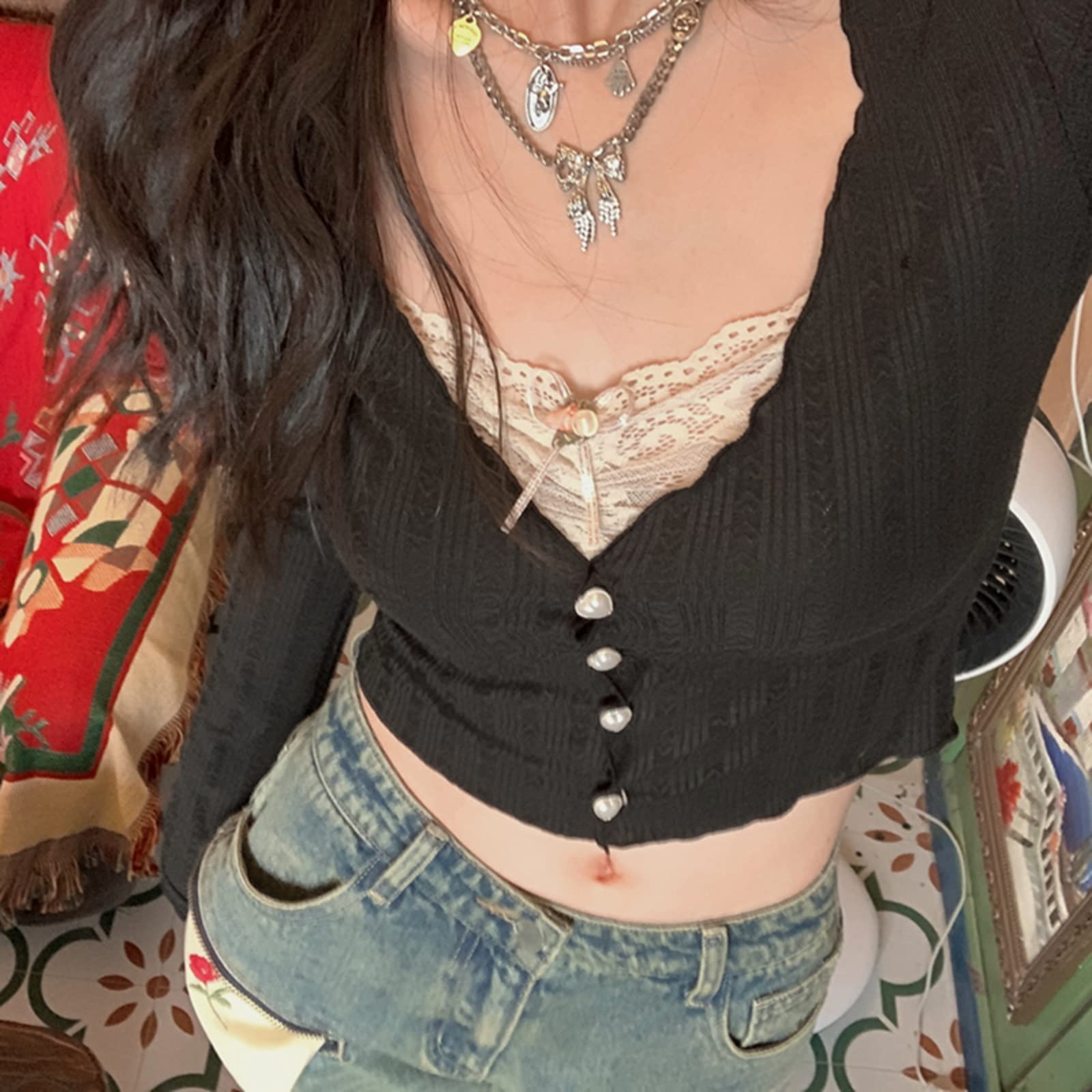 FEATURES: Women y2k tops fairy grunge shirts, long sleeve, solid color, lace trimmed square collar, ribbed knit, lace patchwork, slim fit blouse tops, tight shirts for women, ribbed y2k tops, y2k goth aesthetic clothing, trendy teens 90s egirl Harajuku gothic clothes fall streetwear.