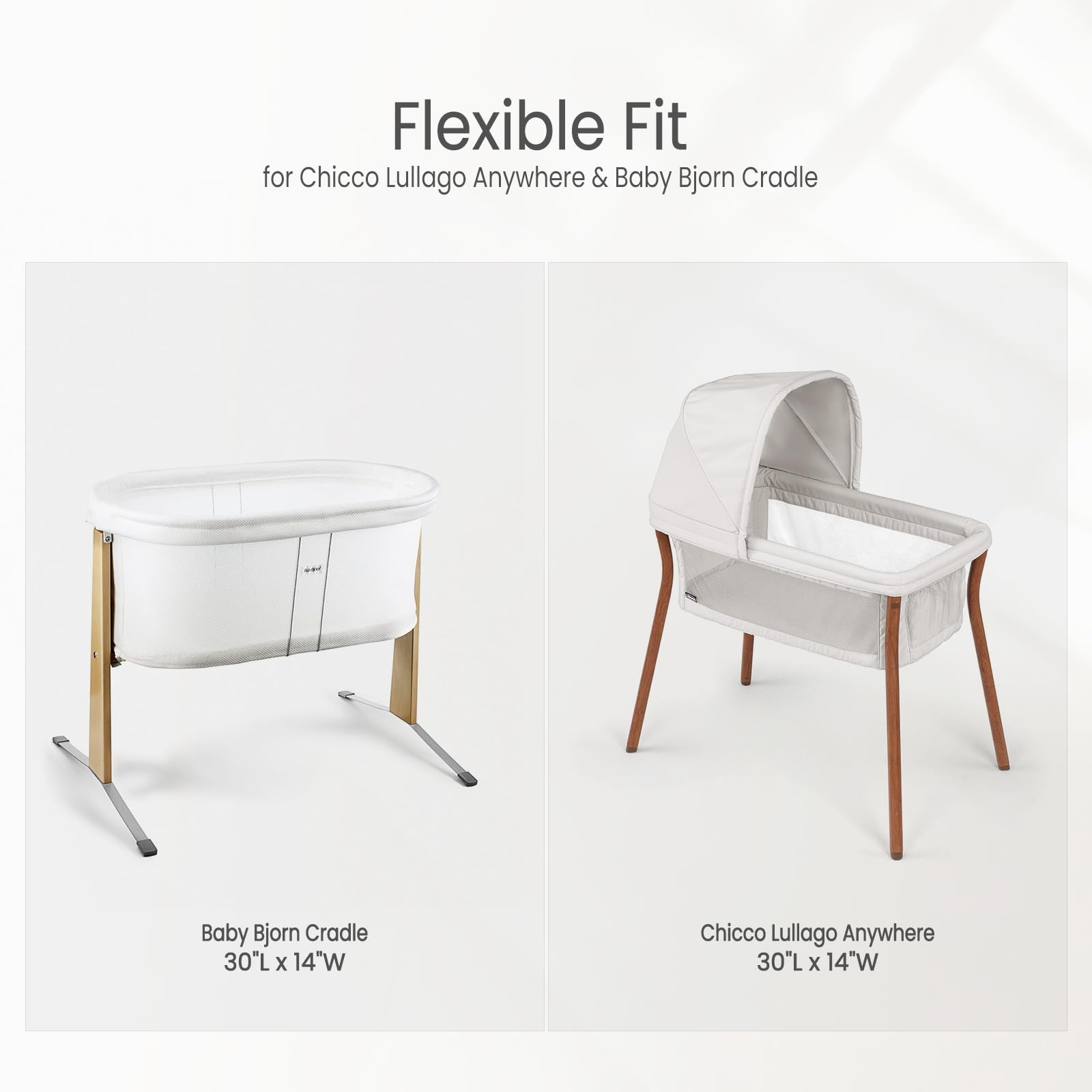 Perfect Custom Fit: This set includes 2 pack 30x14 bassinet sheets are compatible with Chicco LullaGo Anywhere, Baby Bjorn Bassinet, Delta Moses Bassinet and similar size small bassinets. Please make sure your mattress size before you buy!