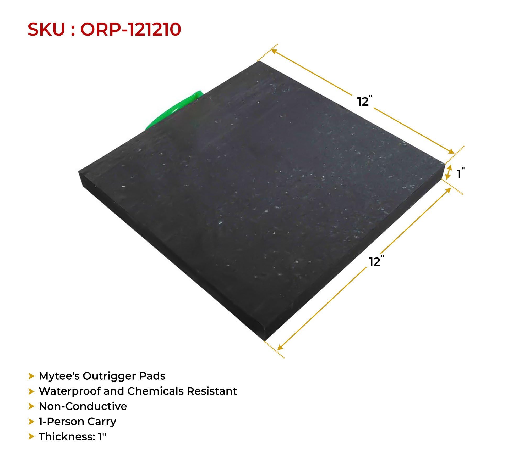 Pack Size: 4 Pack Get Outrigger Pads safety tool for your vehicles’ outriggers, down jacks, or stabilizers. This efficient tool of high-density offers safe operations on various surfaces, preventing vehicle disbalance. If you put your outriggers directly on the ground, there are chances that the ground underneath may shift, be displaced, or collapse. Prevent accidents during crane operations and use our outrigger pads as a safety pad between your vehicle outriggers and the ground. Learn more about it below:- Measurements: The size and thickness of our outrigger pad are 12" (Length) x 12" (Wealth), and 1" (Thickness), respectively. The black and square-shaped outrigger pads are compatible with outriggers, down jacks, and stabilizers to maintain stability and ensure a safe working environment. Durable Material: We’ve engineered our outrigger mats from Ultra-high molecular weight polyethylene (UHMWPE). The material ensures the following features: strength, stiffness, and reliability. Use our robust pads in any lifting and rigging setup and place them under the RV tires, tongue jacks, scissor jack stabilizers, and so on. The high tolerance against acids and alkalis makes it perfect for outdoor use. Anti-Slip & Wide Surface Adaptability: The outrigger pads offer compatibility with various surfaces and grounds, distributing the weight evenly. It prevents cranes from sinking and disbalancing soft ground. You can have secure footing with our anti-slip crane pads, prioritizing safety and environment-friendliness. Easy-to-Use Design: You’ll find a heavy-duty handle in our outrigger pad, which ensures easy transportation and carrying. You can easily carry the outrigger pad following its user-friendly design, thus making it a practical choice for heavy operations. High Performance: Our crane pads have a maximum allowable load crush rating of 200 PSI, ensuring good impact intensity and breaking elongation. Additionally, it has a super compression strength with a great 45-degree load limit of 15,000 lbs and a vertical load limit of 40,000 lbs. Expect high performance from our non-conductive crane pads. Usage: Give your heavy equipment like a support-leg Truck Crane, Crawler Crane, Rough Crane, Boom Pump, Concrete Pump, Fire Truck, etc., an easy-to-use foundation. It also offers a stabilizing setup for small aerial work platforms. **Load-bearing capacity is subject to ground conditions.