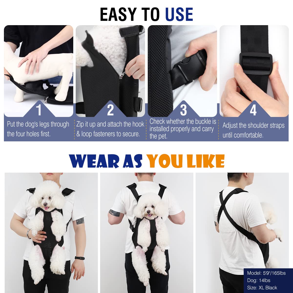 Considerate Detail-oriented Design: Legs-out and tail-out design keep your pet safe and comfortable; Hook and loop, zipper and elastic openings allow you to fit your dog inside comfortably; Quick Release Buckles on the end of straps ensure quick installation with just one hand.