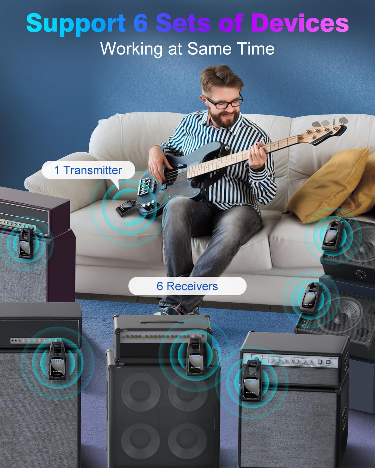 Support 6 Devices——The wireless system support 6 pairs of wireless systems working at same time in the same environment,one-to-one and no-interference; Also support one transmitter to send signals to 6 receivers(note: the same product model).