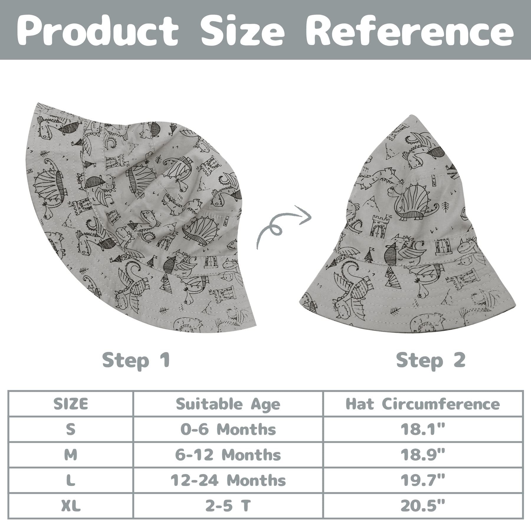 SIZE INFO: This toddler sun hat is available in 4 sizes for your choice. Extra small size for 0-6 Months infants, Head Circumference:18.1"=(46cm); Small size for 6-12 Months babies, Head Circumference:18.9"=(48cm); Medium size for 12-24 Months todders, Head Circumference:19.7"=(50cm); Large size for 2-5 years kids, Head Circumference:20.5"=(52cm). The age recommendation is only for reference, you can choose size selection according to your baby's head girth.