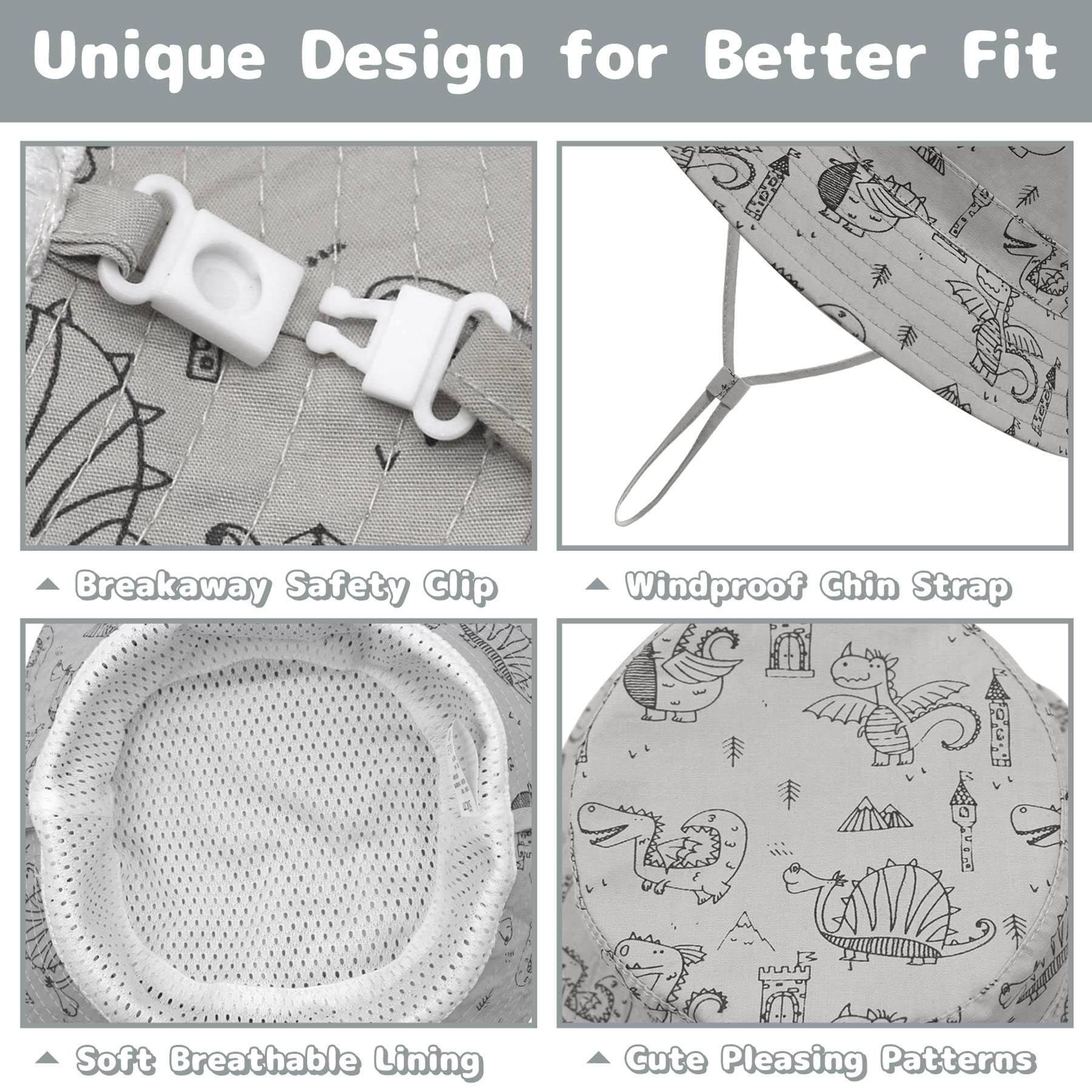 ADJUSTABLE & FITS WELL: Our toddler sun hat is designed with adjustable chin straps without plastic buckles, which can be more eco-friendly and skin-friendly, and offer a customized fit. And the infant sun hat has a breakaway safety clip which can be simply clipped back in.