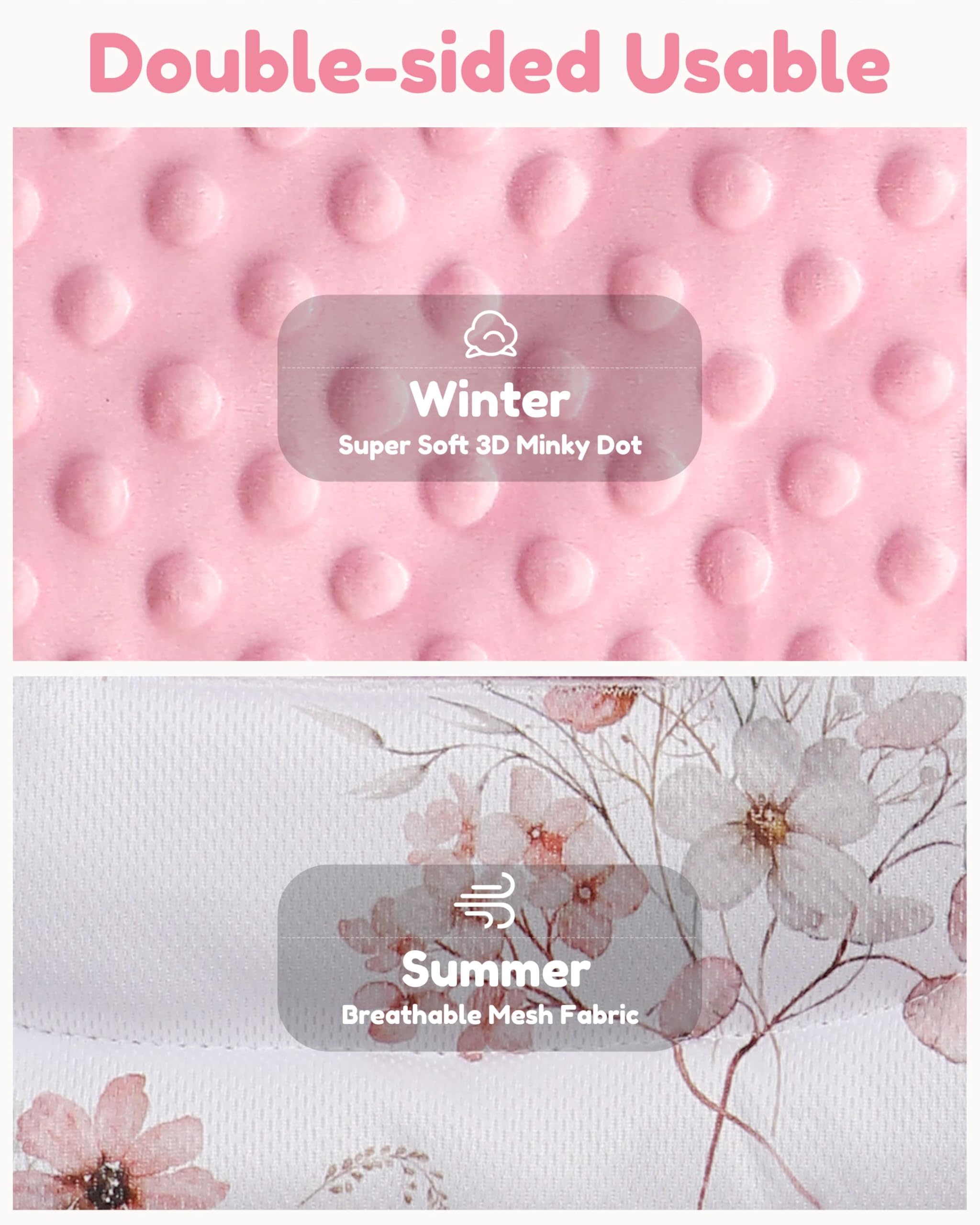 Double-Sided, Comfort for ALL Seasons: Soft Minky Dotted Plush fabric on front side (cozy for winter) + breathable mesh fabric on back side (cool for summer). Adorable prints stimulate sensory development. Gentle on skin and perfect for road trips, park walks, or indoor rocker