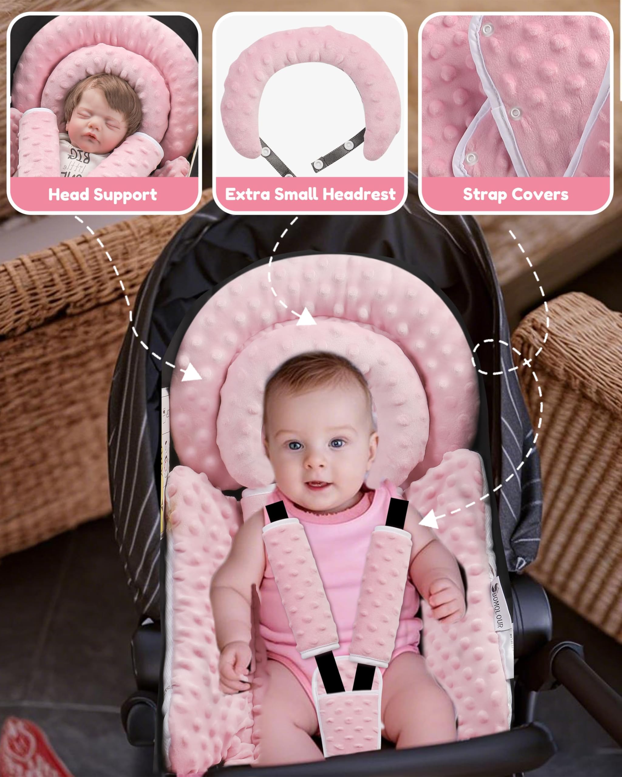 Full head support for babies 0-12 months: Removable crescent head cushion + thick padding adapts from preemie to toddlers. Full head support prevents head shaking (0-3M); remove cushion for older babies (3-12M). Fluffy body support padding makes baby more comfortable in infant car seats, baby strollers, or swings and rockers, baby bouncers, bassinets. No more buying multiple inserts