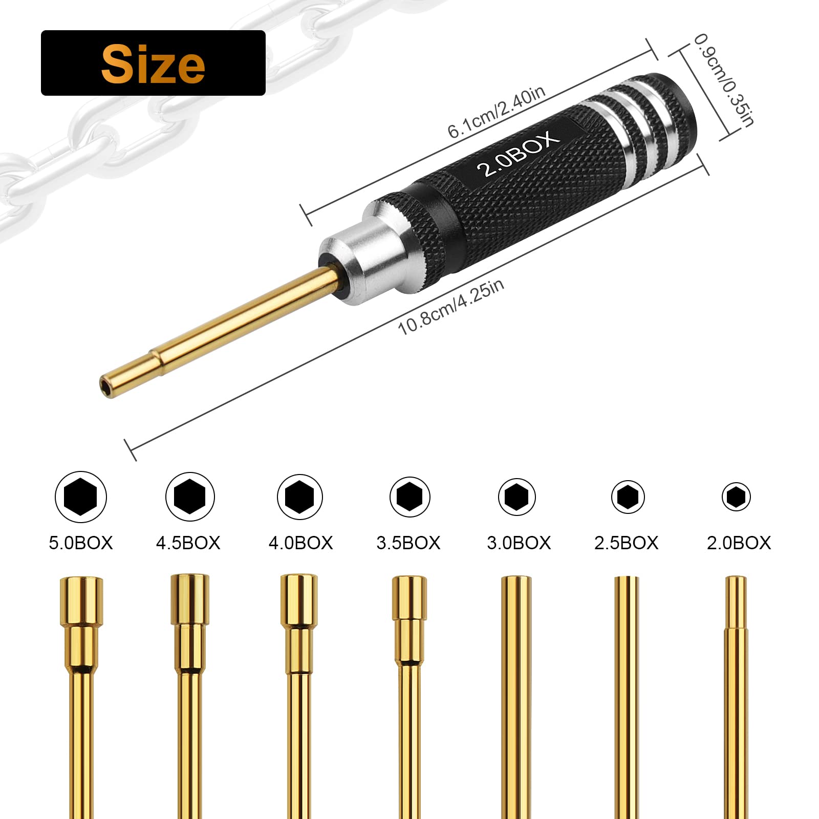 Size: 5.0 4.5 4.0 3.5 3.0 2.5 2.0mm Hex Box Wrench, 7 pack mini rc car repair tool kit sets, total length: Approx 108mm; handle length: Approx 60mm;