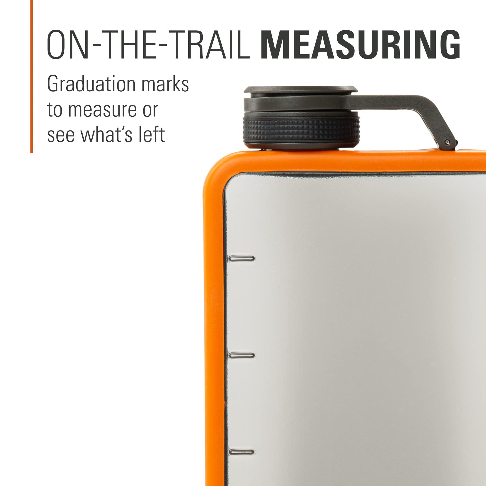 Wide mouth opening makes for easy filling, pouring and drinking; Molded graduation marks help you quickly measure or see what’s left while you’re on the trail