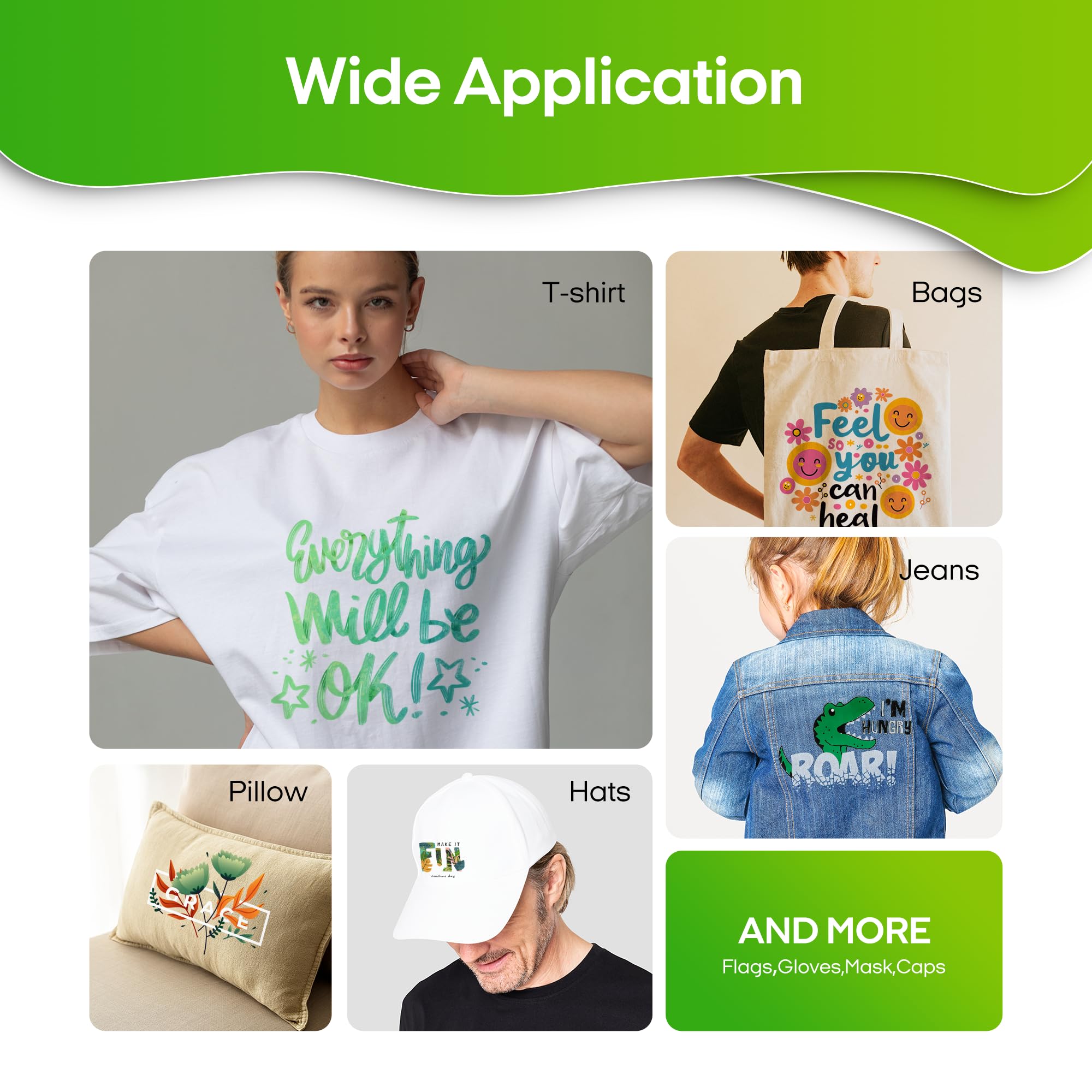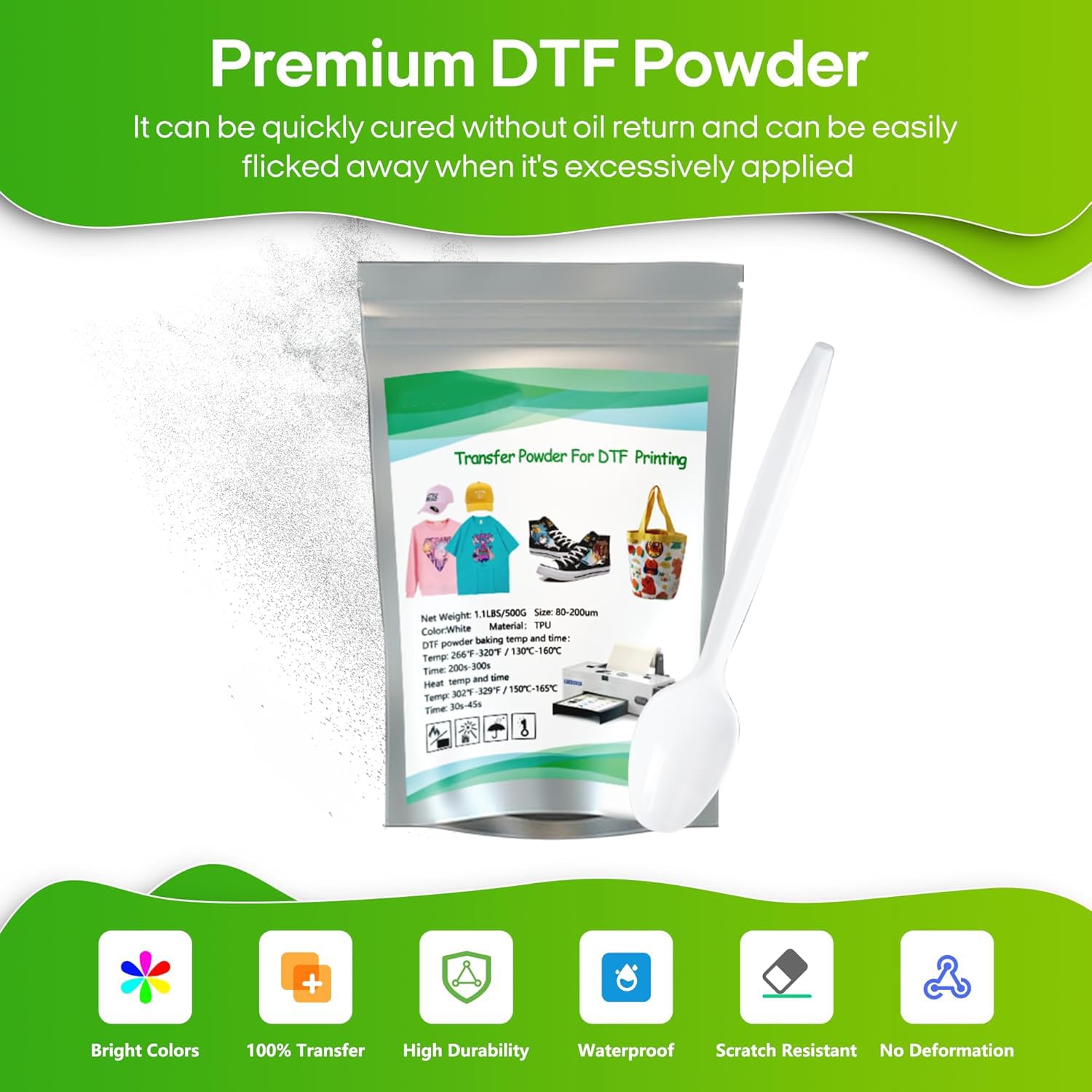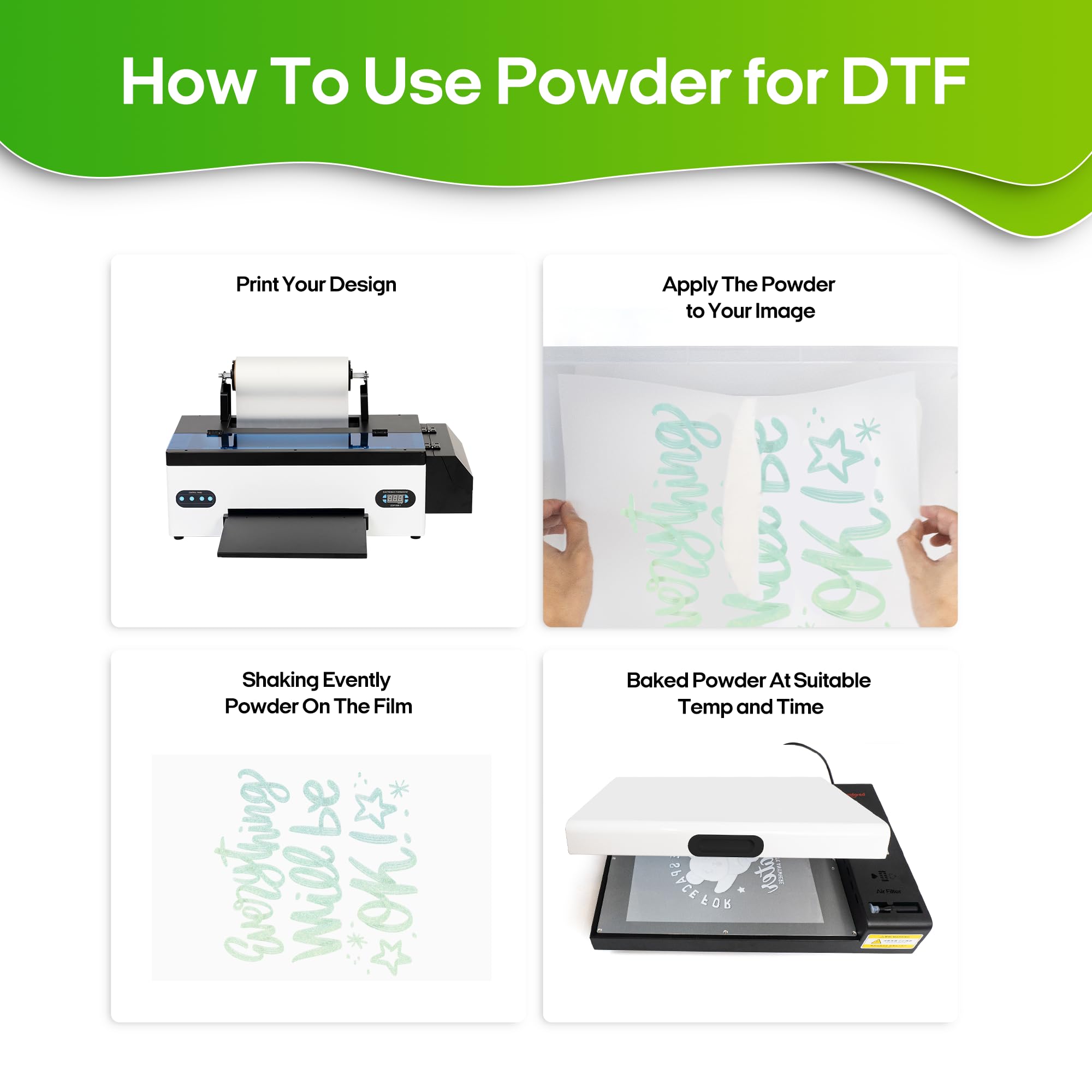 [Compatibility] DTF Powder adhesive is compatible with all DTF printers and films of any size. No need to search for different printers or films, as our powder works seamlessly with various surfaces and fabrics