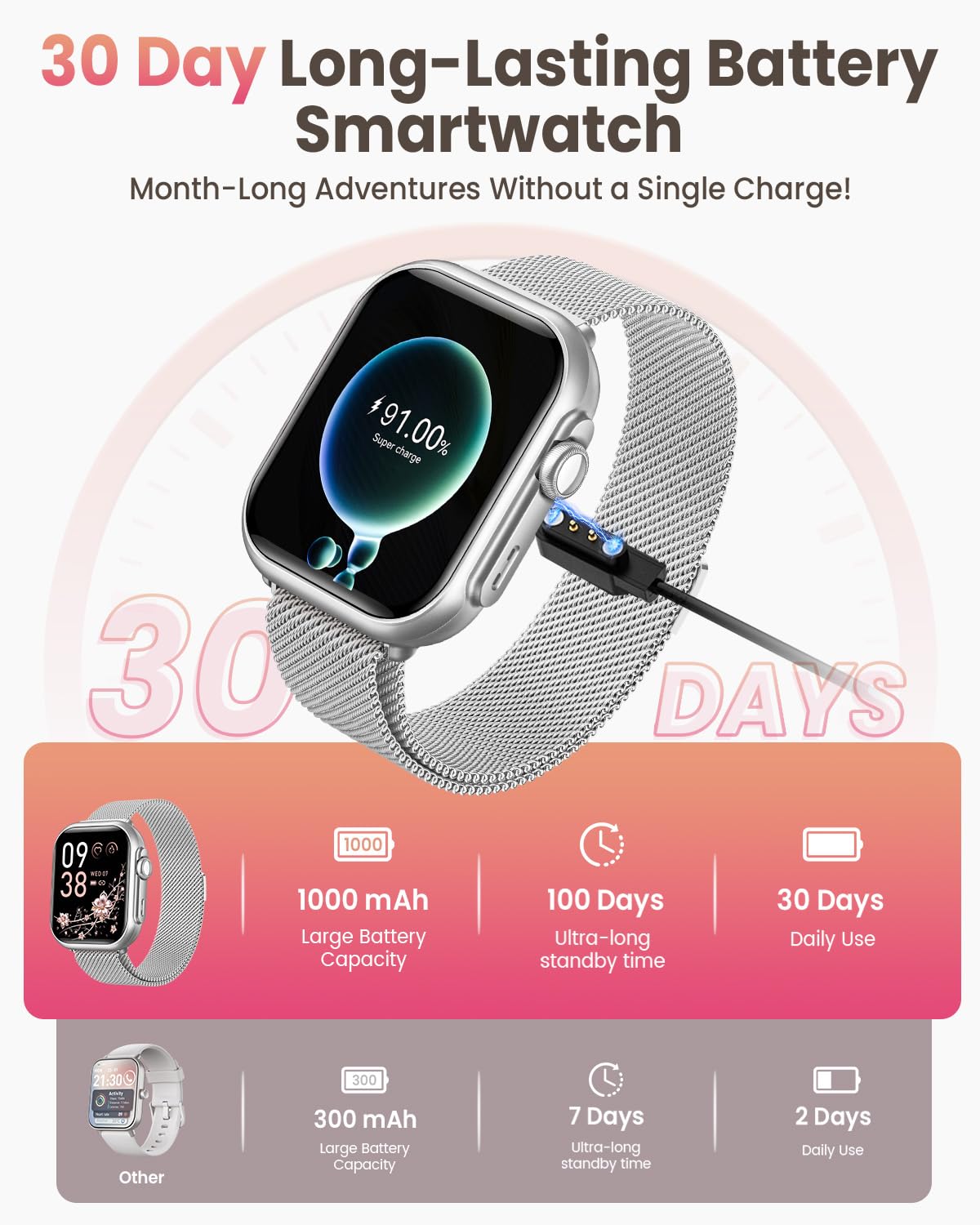 30 Days+ Battery Life:Smart watches for men women features a massive 1000mAh battery, offering 30 days of use (100 days standby) on a single 2.5-hour charge. Perfect for outdoor adventures, business trips, or daily fitness tracking without constant charging. Compatible with iOS 9.0+ and Android 6.0+ smartphones, it outperforms some other android smart watch and smart watch for iPhone compatible devices in battery capacity