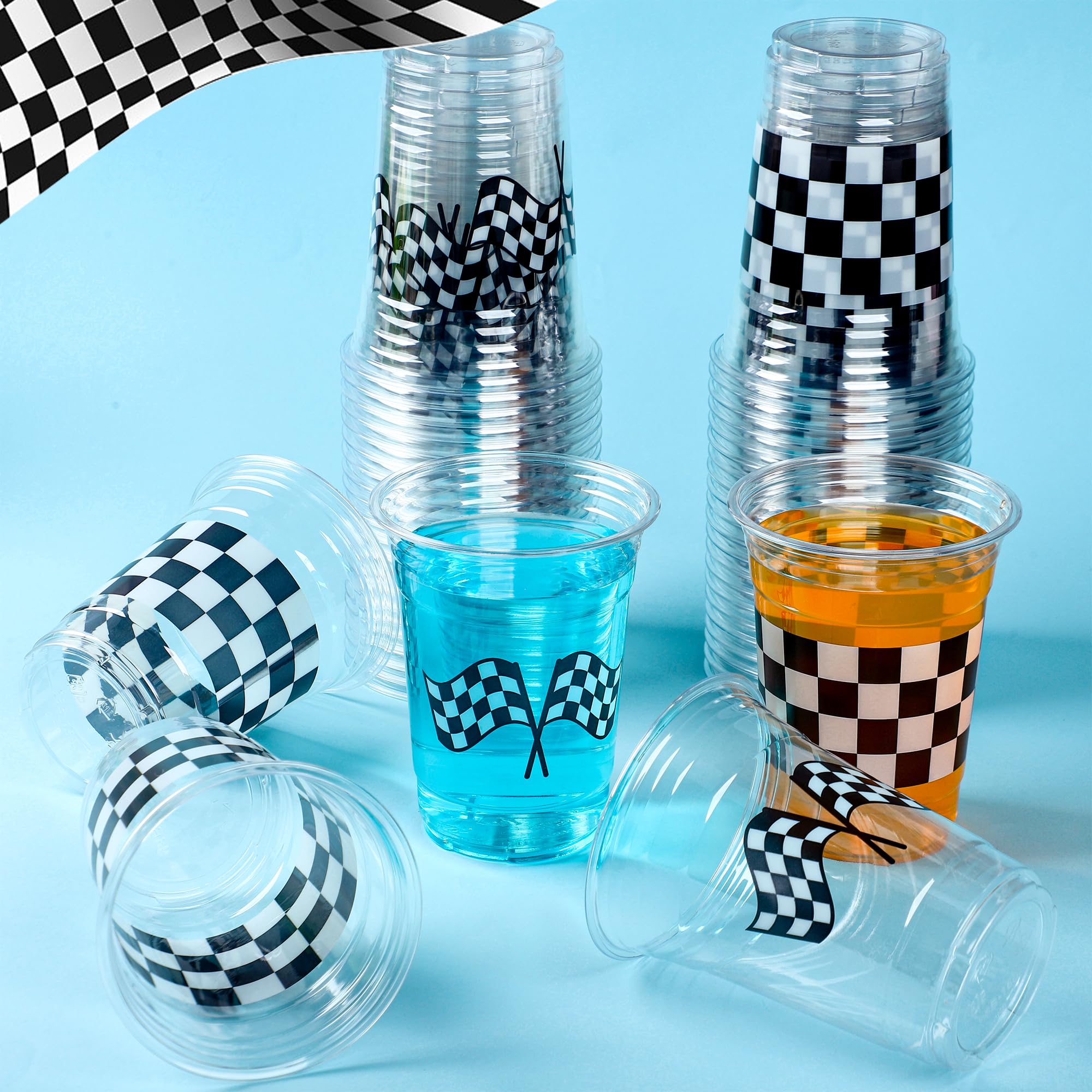 peony man 50 Pcs Checkered Racing Party Plastic Cups 16 oz White Black Checkered Flag Clear Cup Disposable Race Car Drinking Cups for Race Car Sports Themed Birthday Party Favors Supplies