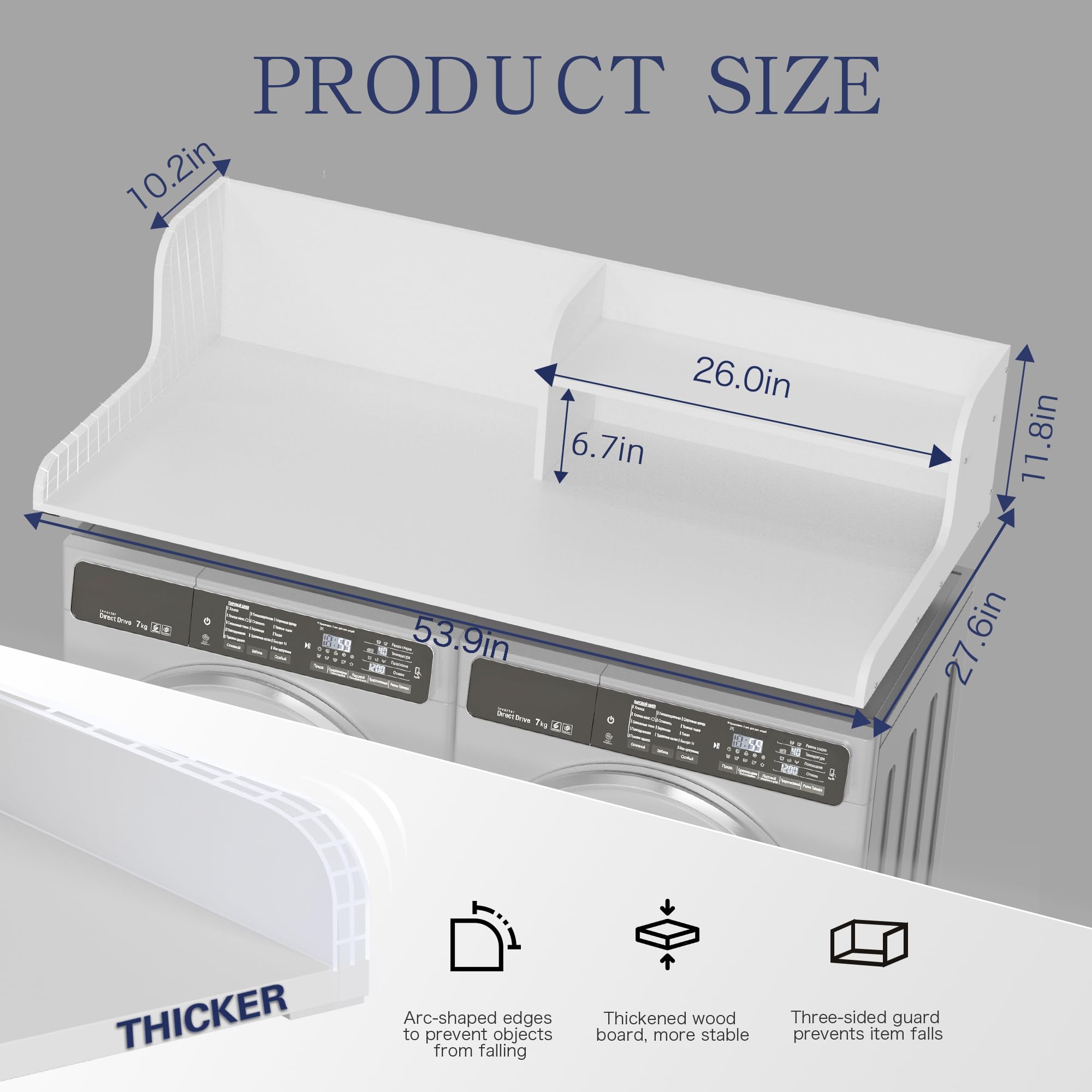 SPACIOUS AND FUNCTIONAL: Our washer and dryer covers for the top measures 54 inches wide and 27.6 inches deep, offering spacious working area for all your laundry needs including folding clothes, sorting laundry, organizing laundry supplies. Our washer dryer wood countertop has 2.4-inch high edge rail above to prevents items from falling off. Our laundry topper could provide a hassle-free washing and drying experience.