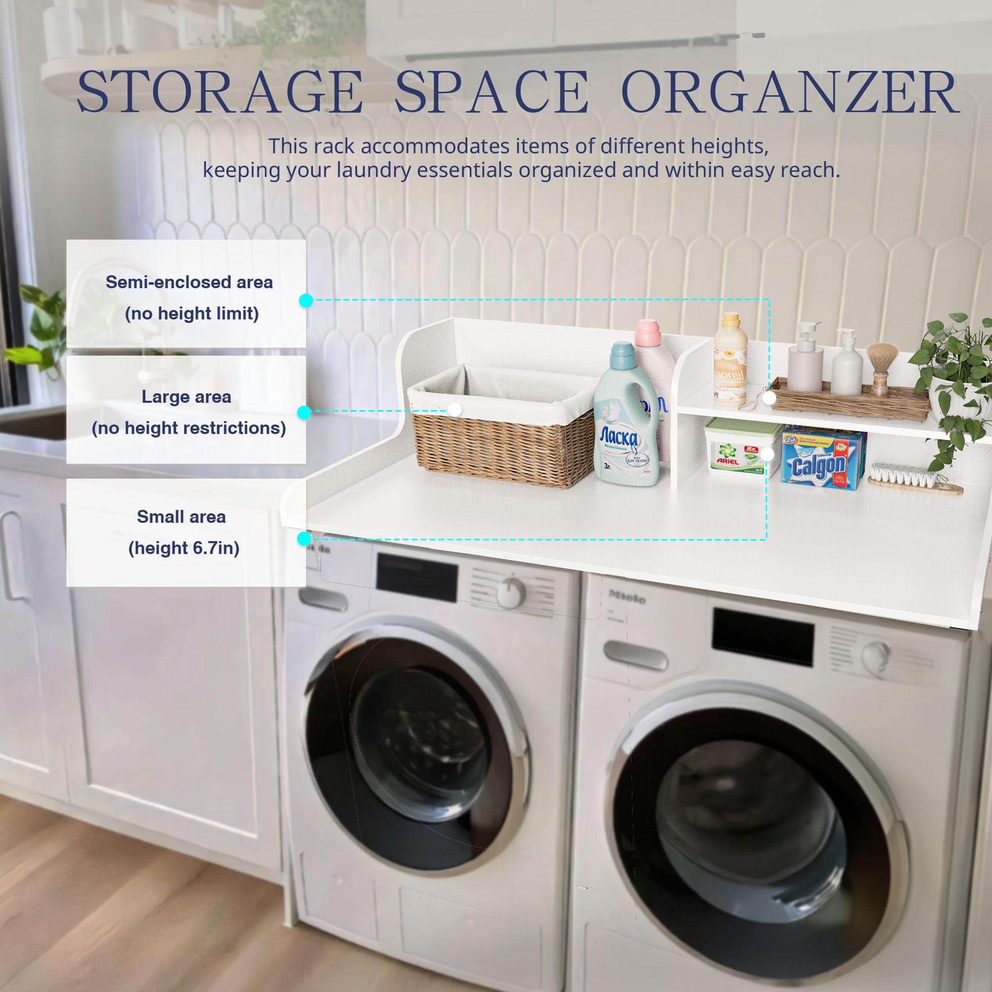 EFFICIENT STORAGE SOLUTION: We designed two spaces for different heights storage. The left side for taller items, such as laundry detergent and storage baskets and the right side with double-layer storage area for low items, such as laundry beads. Our washer dryer countertop is integrated with operation and storage, so you can not only have a large operating countertop, but also have extra storage space for diverse needs.