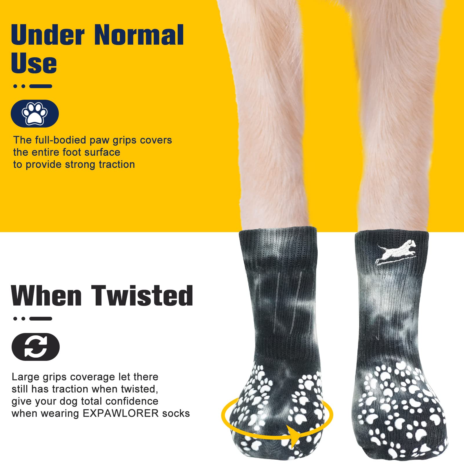 [Double Side No-Skid] It's our patent-exclusive design, Each side of the sock has [21 Cute Little Paw Grips] to provide strong extra traction when your dog is walking on the smooth floor. Even if the socks twist, they will still work. It's good for active dogs, and If your senior dogs has problems who was splaying and keeps slipping on your wooden floors with their back legs, it can help your old friends walk around in the house again!