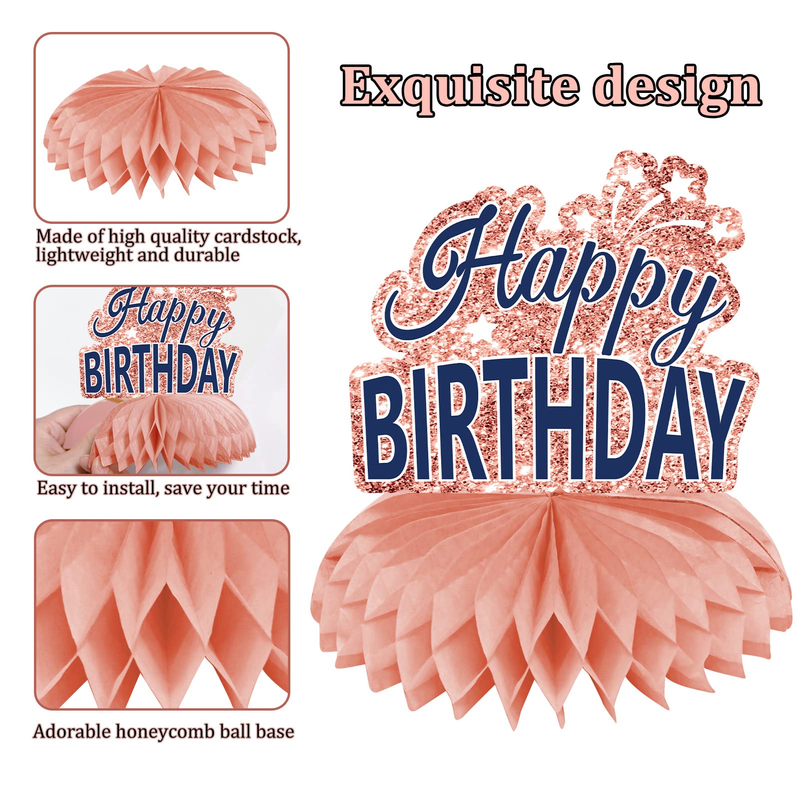[You will get] - 8pcs rose gold blue happy birthday table honeycomb centerpieces decorations, including 8ps birthday themed cards, 8pcs paper honeycomb balls (5 rose gold, 3 navy blue).