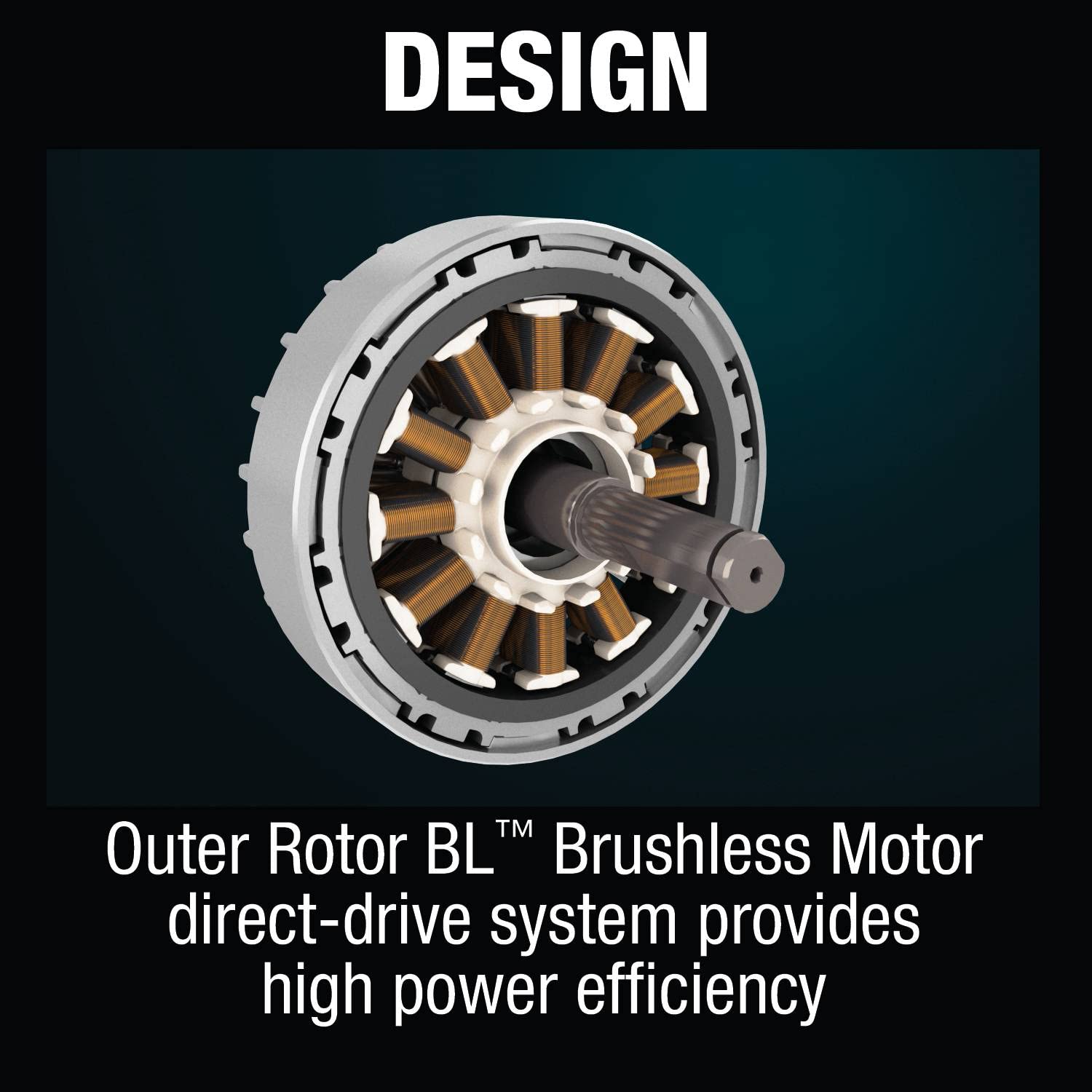 Makita-built Outer Rotor Brushless Motor direct-drive system provides power equivalent to a 22cc gas chain saw