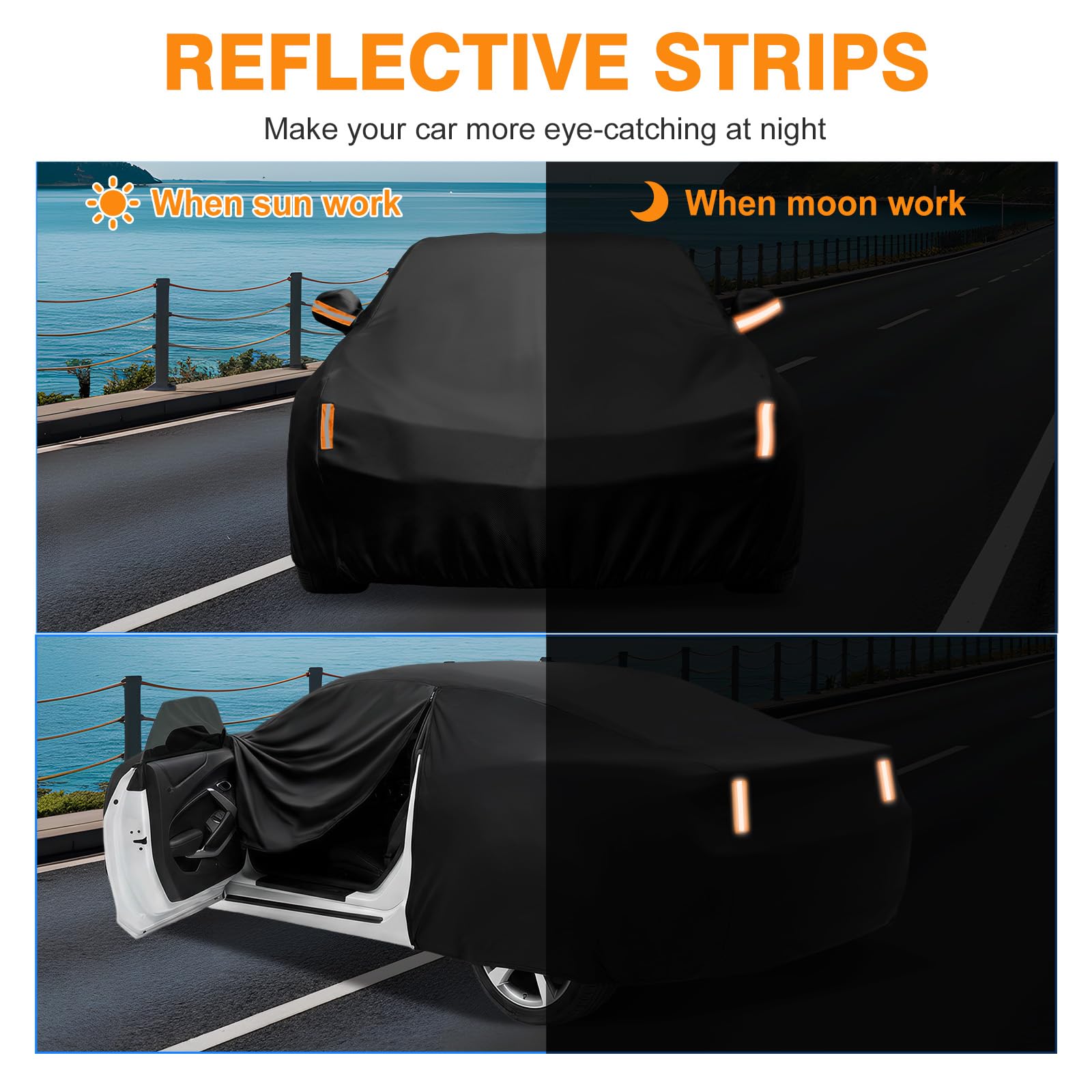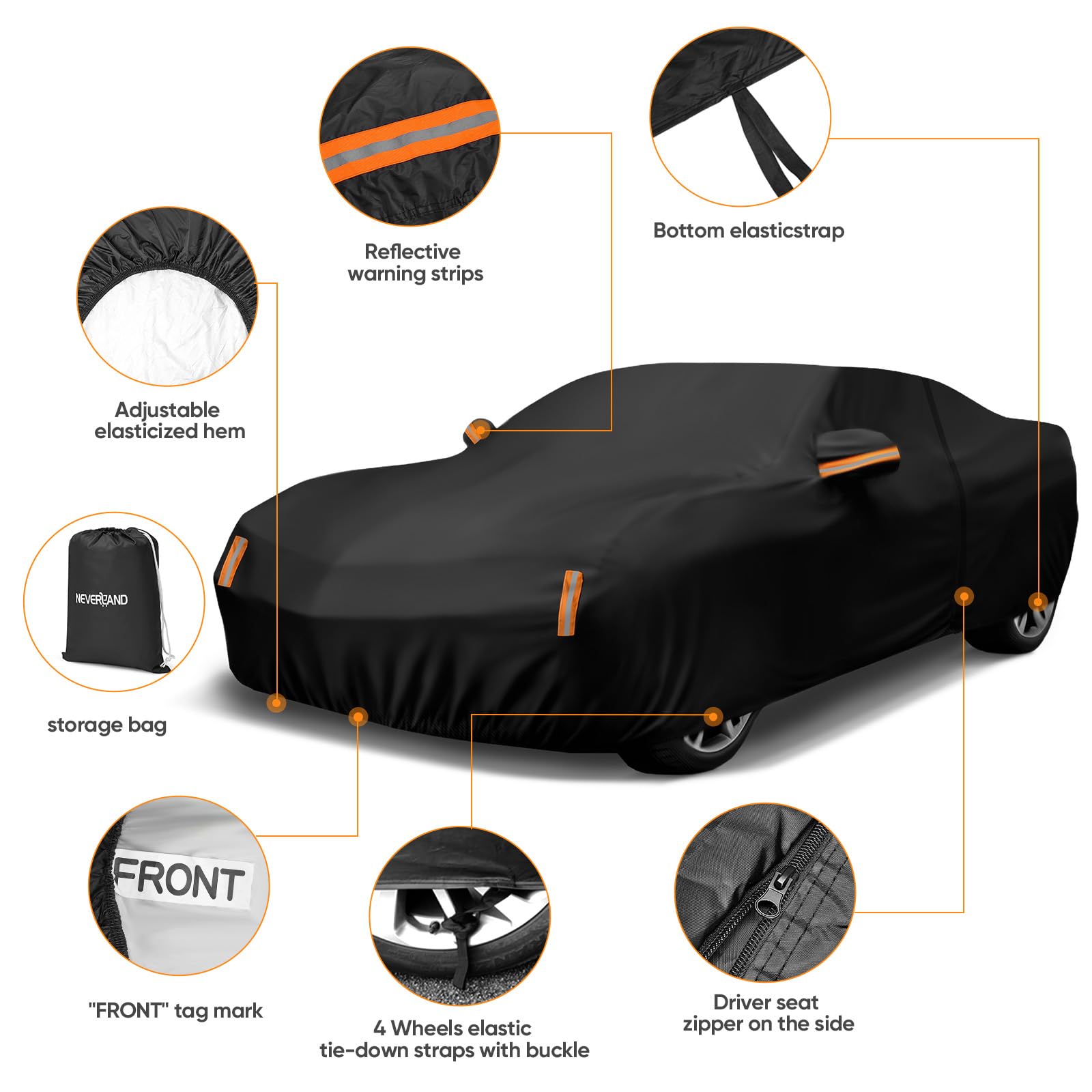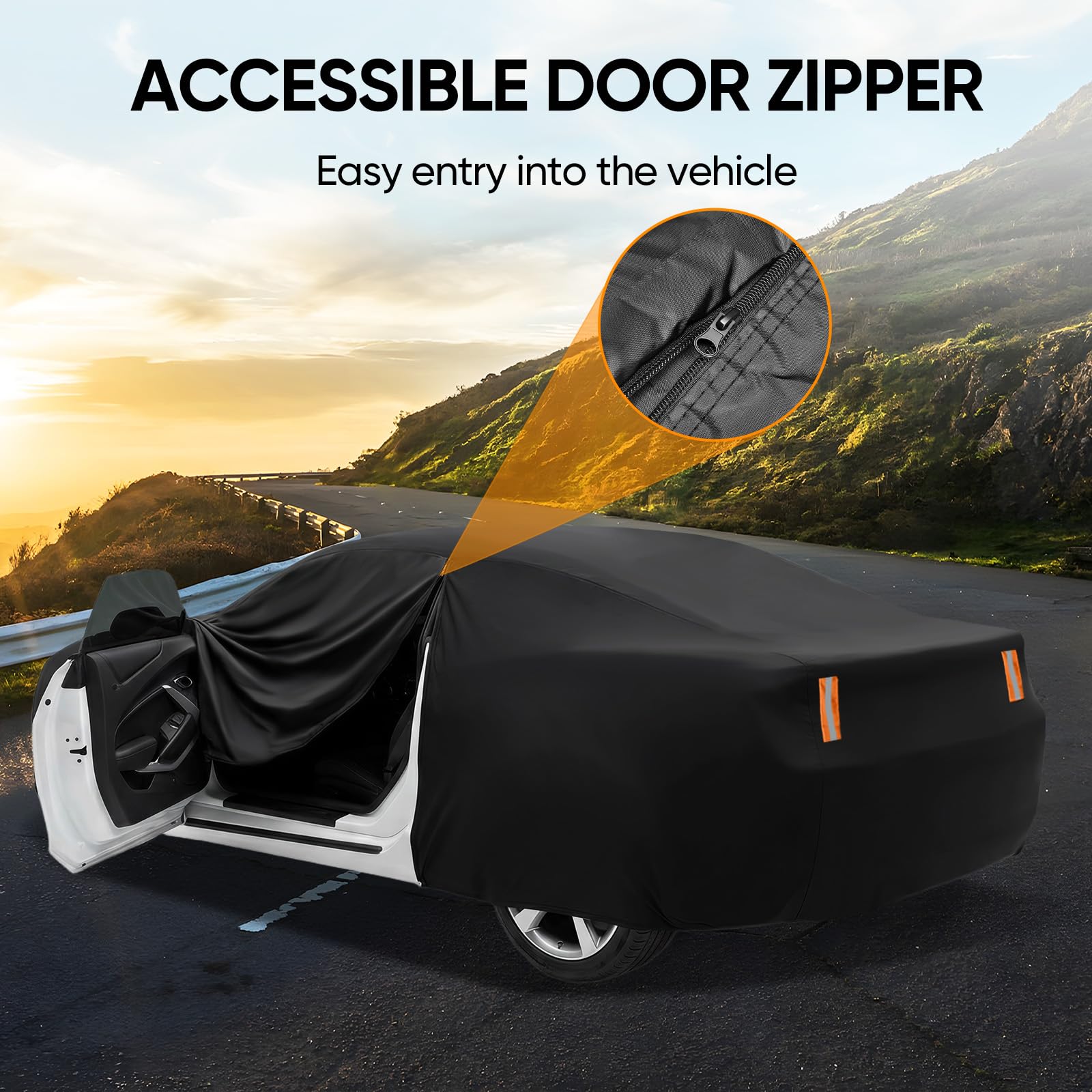 Driver Door Zipper ,Elastic Hem Type & Wheel Fixing Strap: 1)Driver Door Zipper for Easy Access. 2) All four tires can be fixed to Protect Your Auto Cover not Blown Away by Heavy Wind. 3) Reflective Stripes Make you car stay in safe