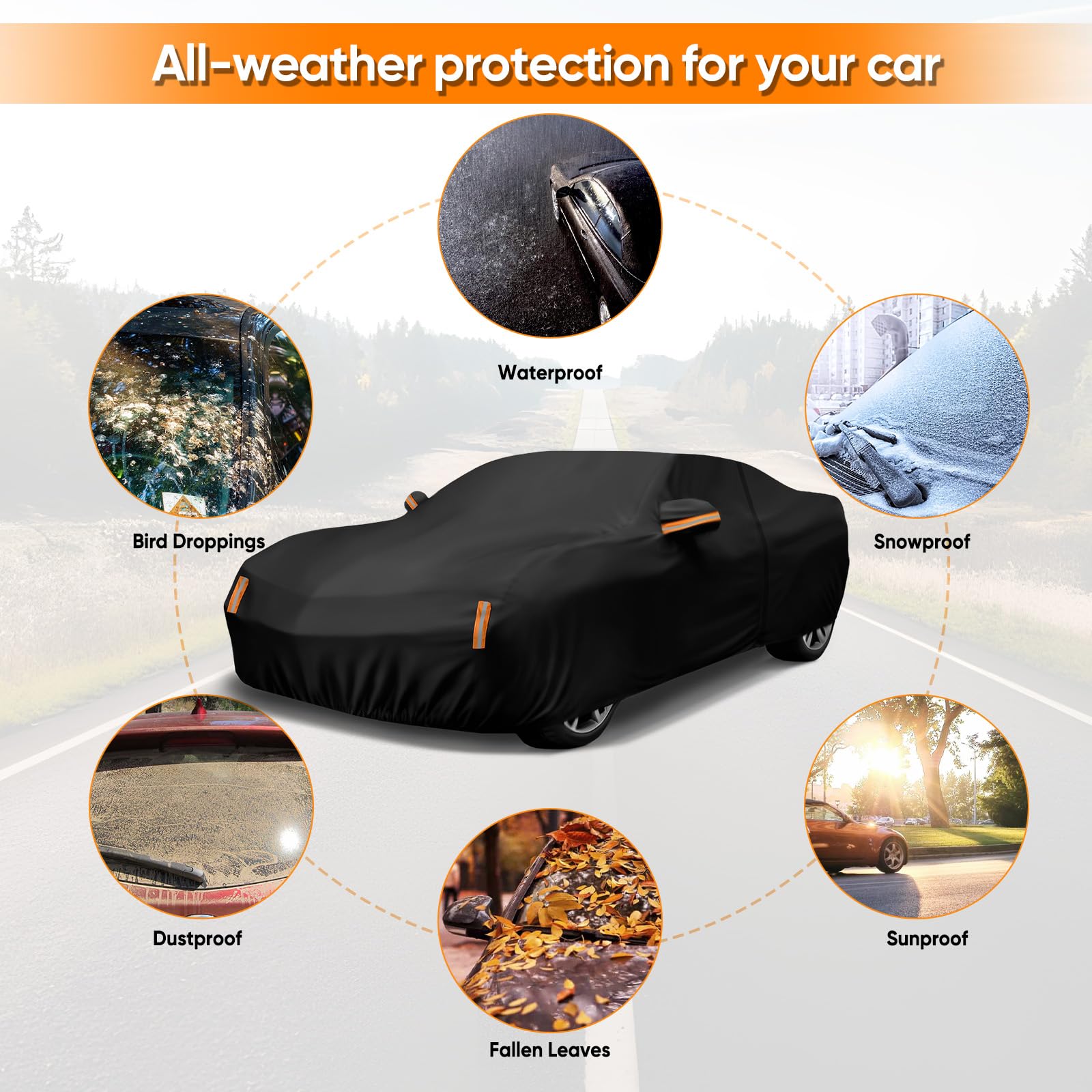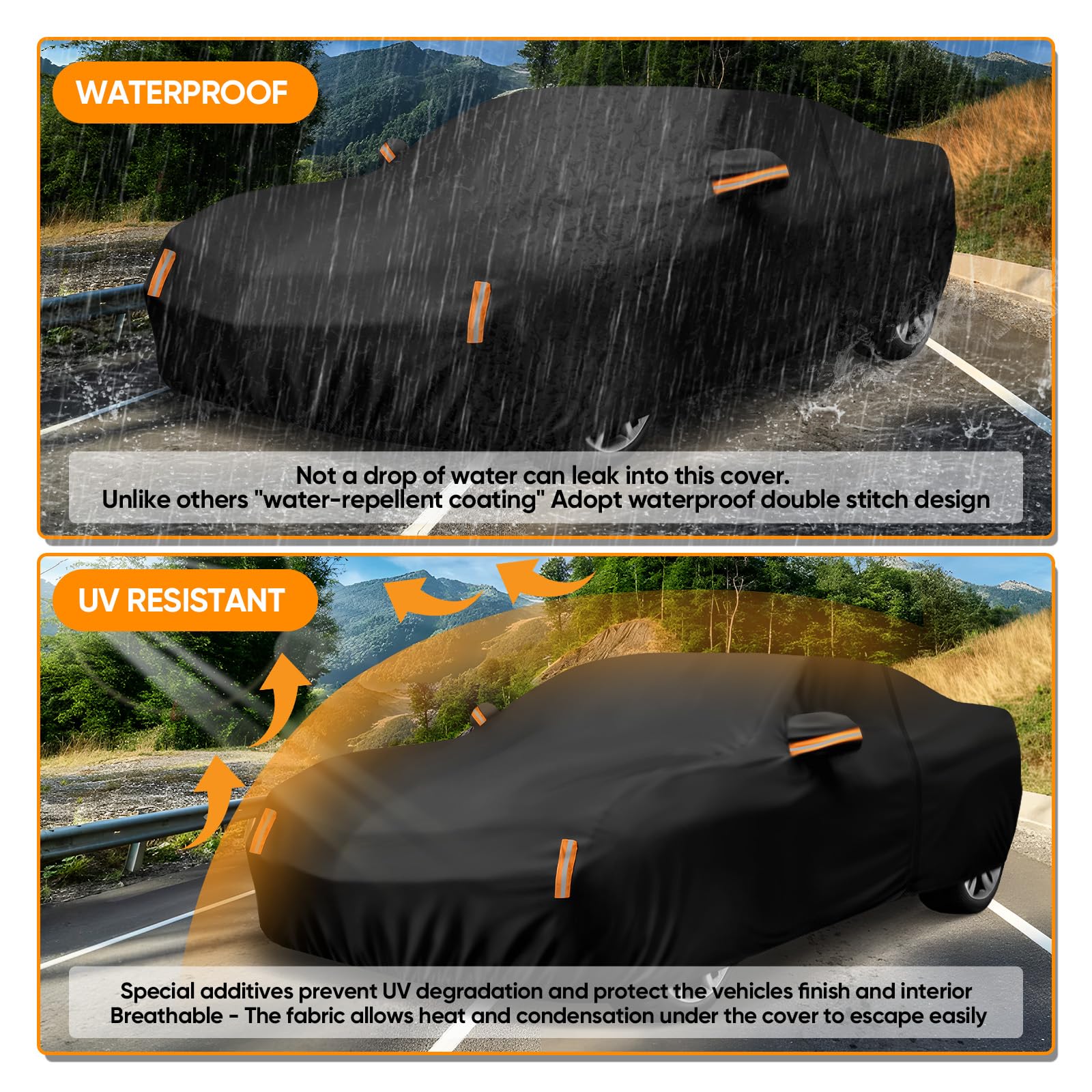 Superior Material Quality: Our full Car Cover is manufactured using premium polyester fabric. This material not only meets stringent environmental standards, ensuring it is eco-friendly, but also provides excellent tear resistance and durability. It is gentle on your car's paint, preventing scratches and fading caused by environmental exposure, making it the ideal choice for car covers for automobiles and suv cover waterproof all weather