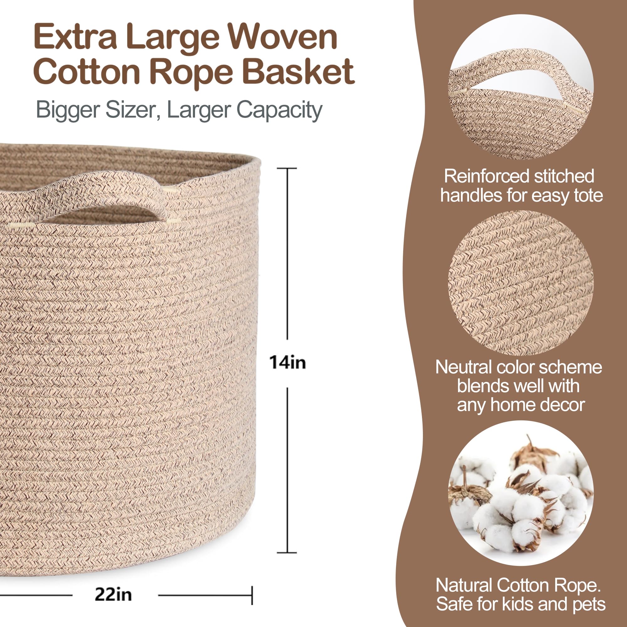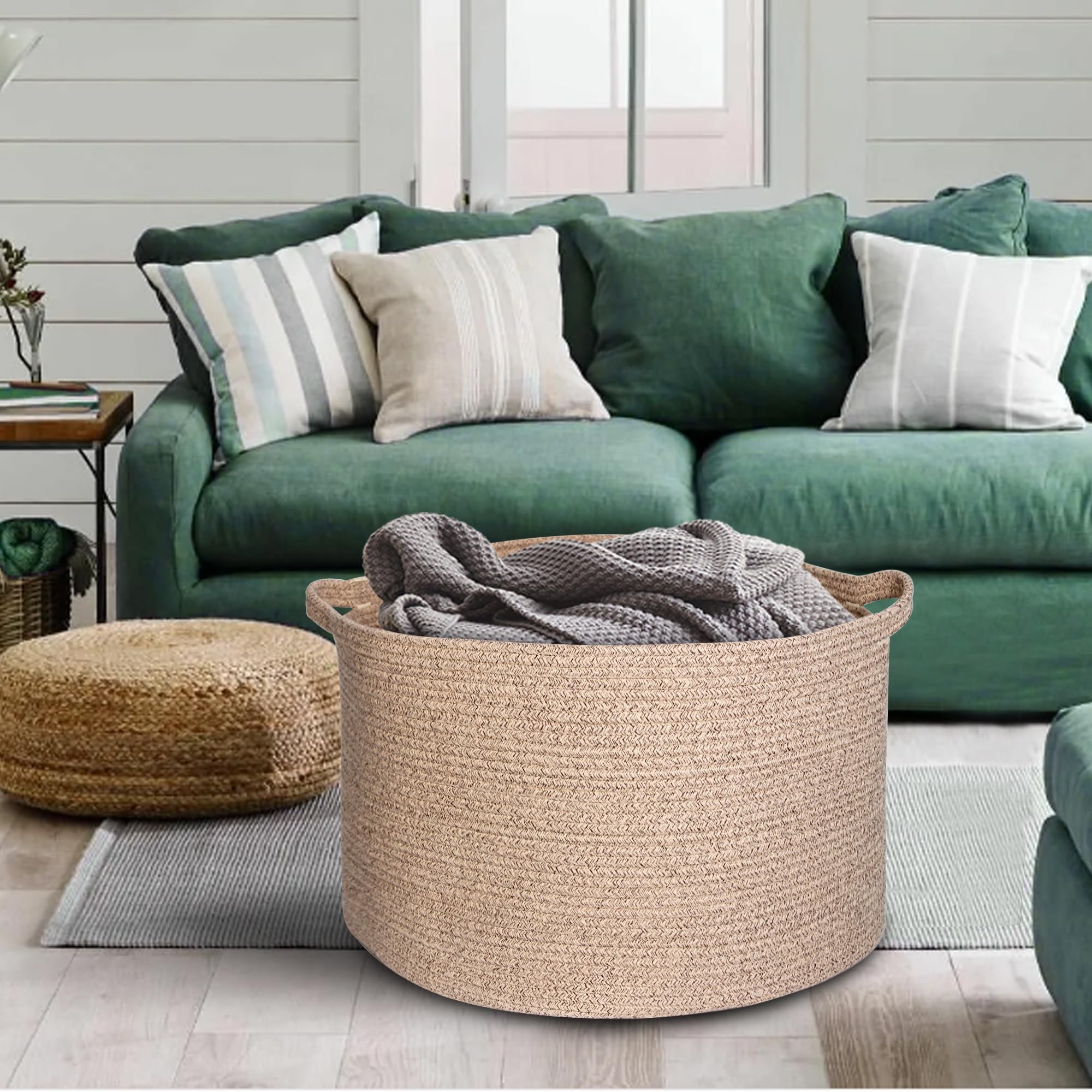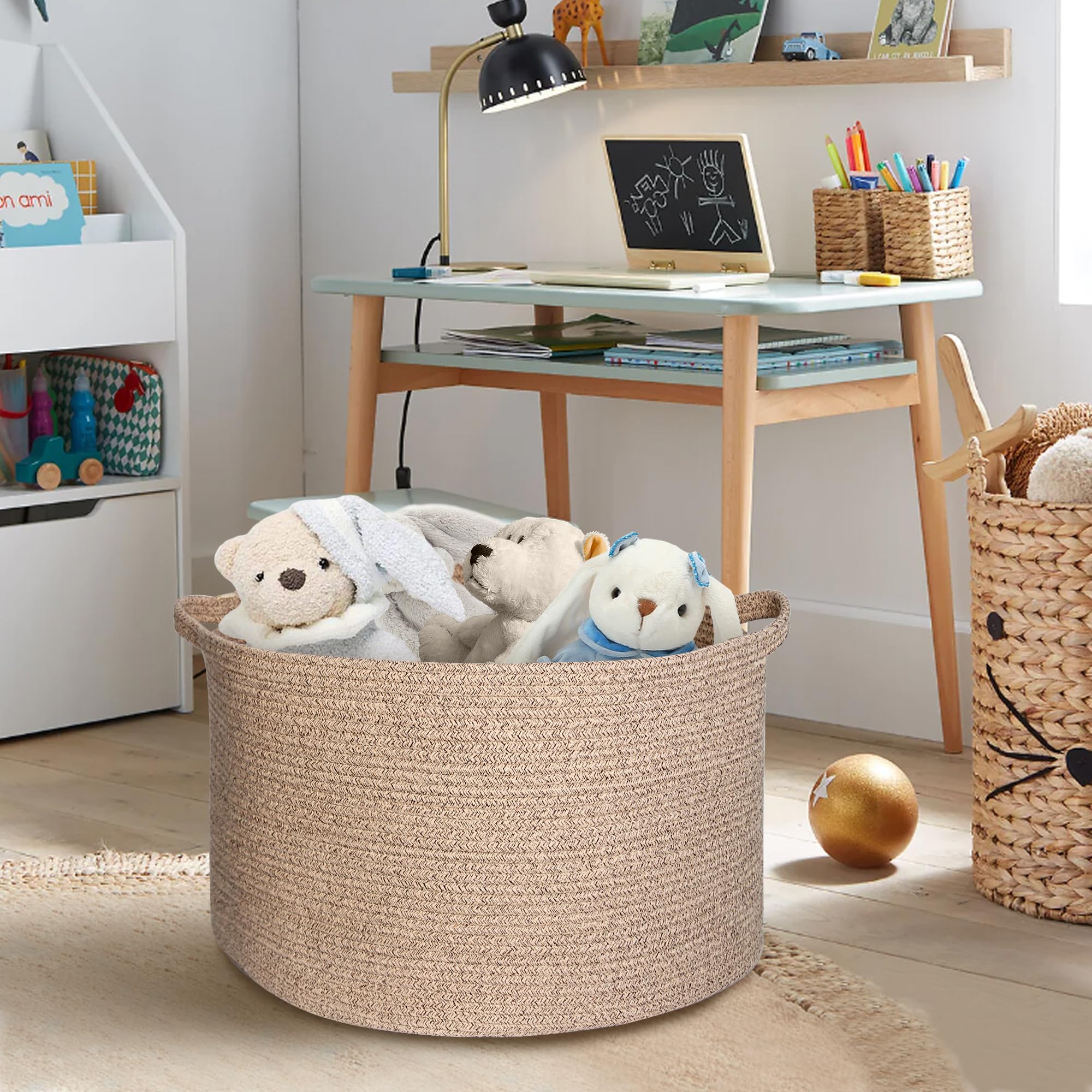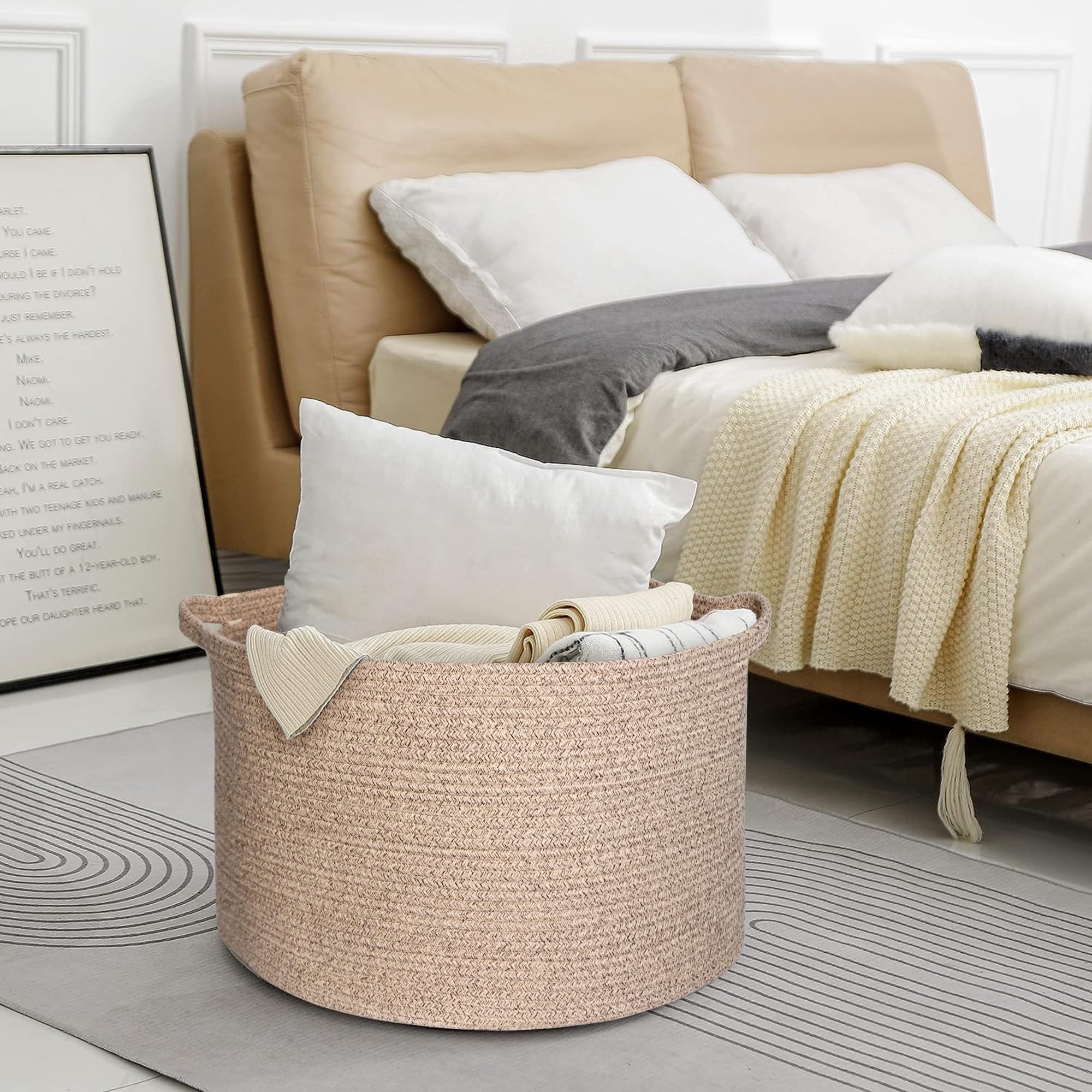 SOFT COTTON ROPE BASKET: The brown basket is braided from natural cotton rope, making it a super soft but sturdy, textured bin. The rope basket for storage is huge and doesn't have a smell at all. Woven rope baskets with no hard edges are safe for your kids allowing them to climb into these wick basket and won't scratches or damage the floors.