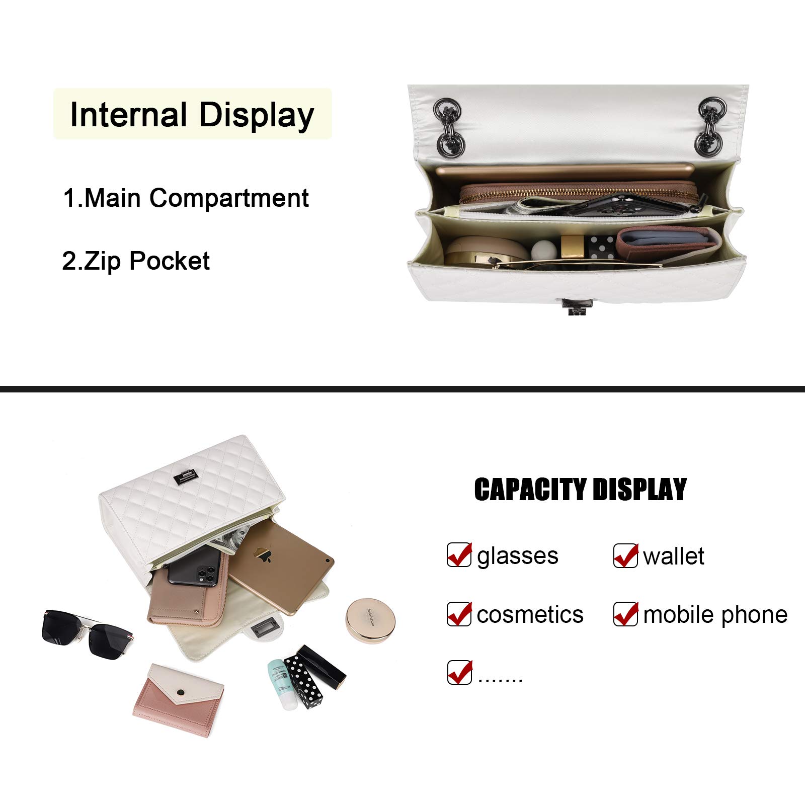 Structure: Internal: 1 main compartment with 1 zip pocket; This small crossbody bag can hold small essentials like phone, cards, wallet, sunglasses, cosmetics and so on.