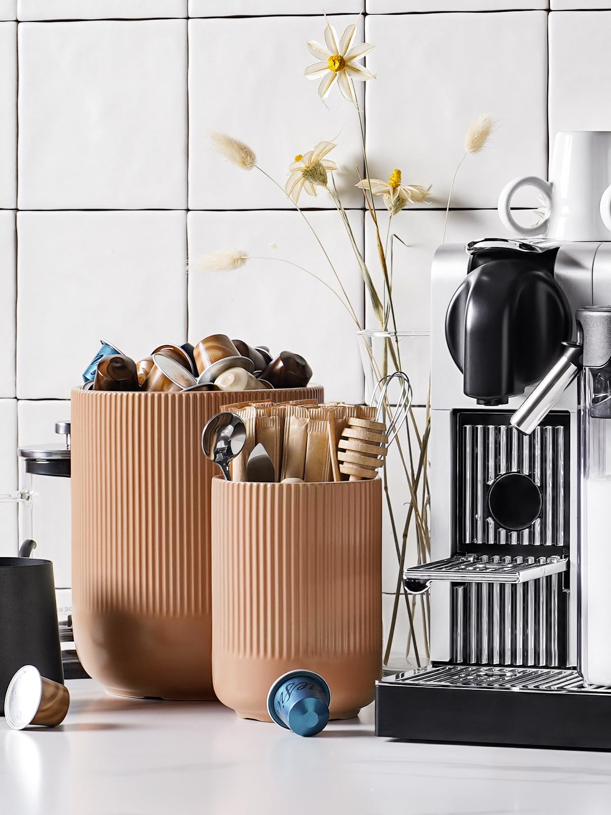 Multi-Functional Utensil Holder: These kitchen utensil holders do more than just store cooking utensils; They also double as elegant vases, offering a stylish home for hair tools like combs, and can seamlessly house coffee pods and stirrers on your bar countertop; Their versatility knows no bounds