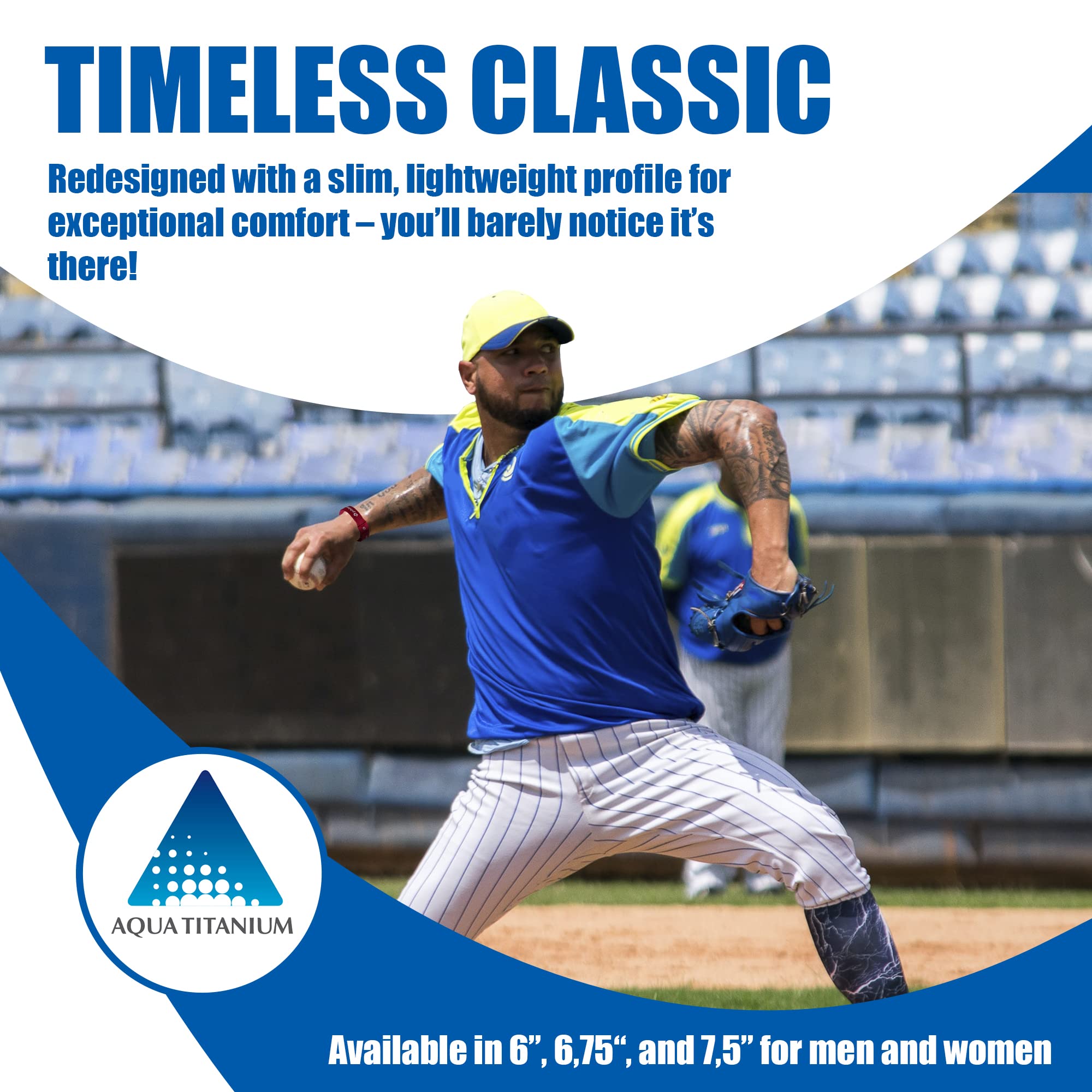 The classic titanium bracelet has been redesigned with a slim, lightweight profile for exceptional comfort - you'll barely notice it's there. The soft aqua-titanium coated elastic band pulls freely over your hand, and stays on securely while you dish out your best performance.