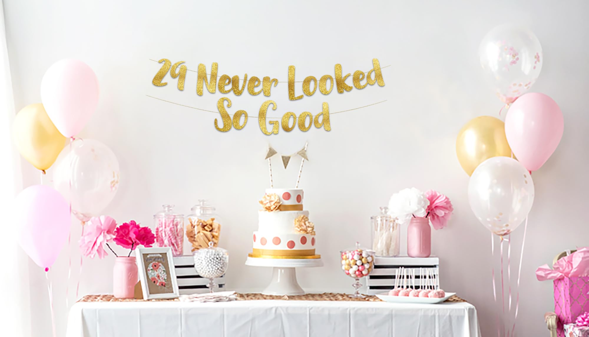 Congrats on 29 years of excellence! This gold glitter banner is the perfect decoration to add a touch of classy decor and welcome your guests to the occasion.