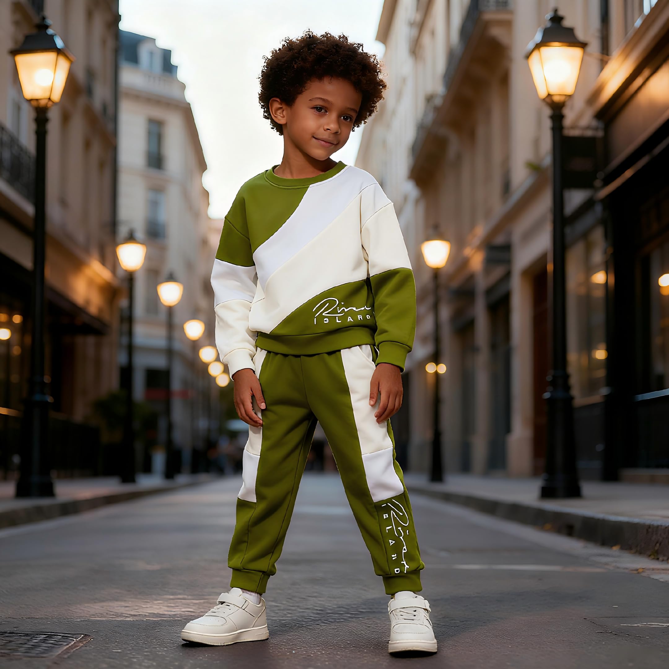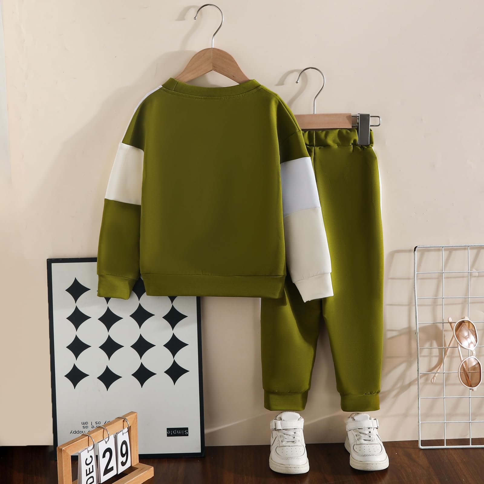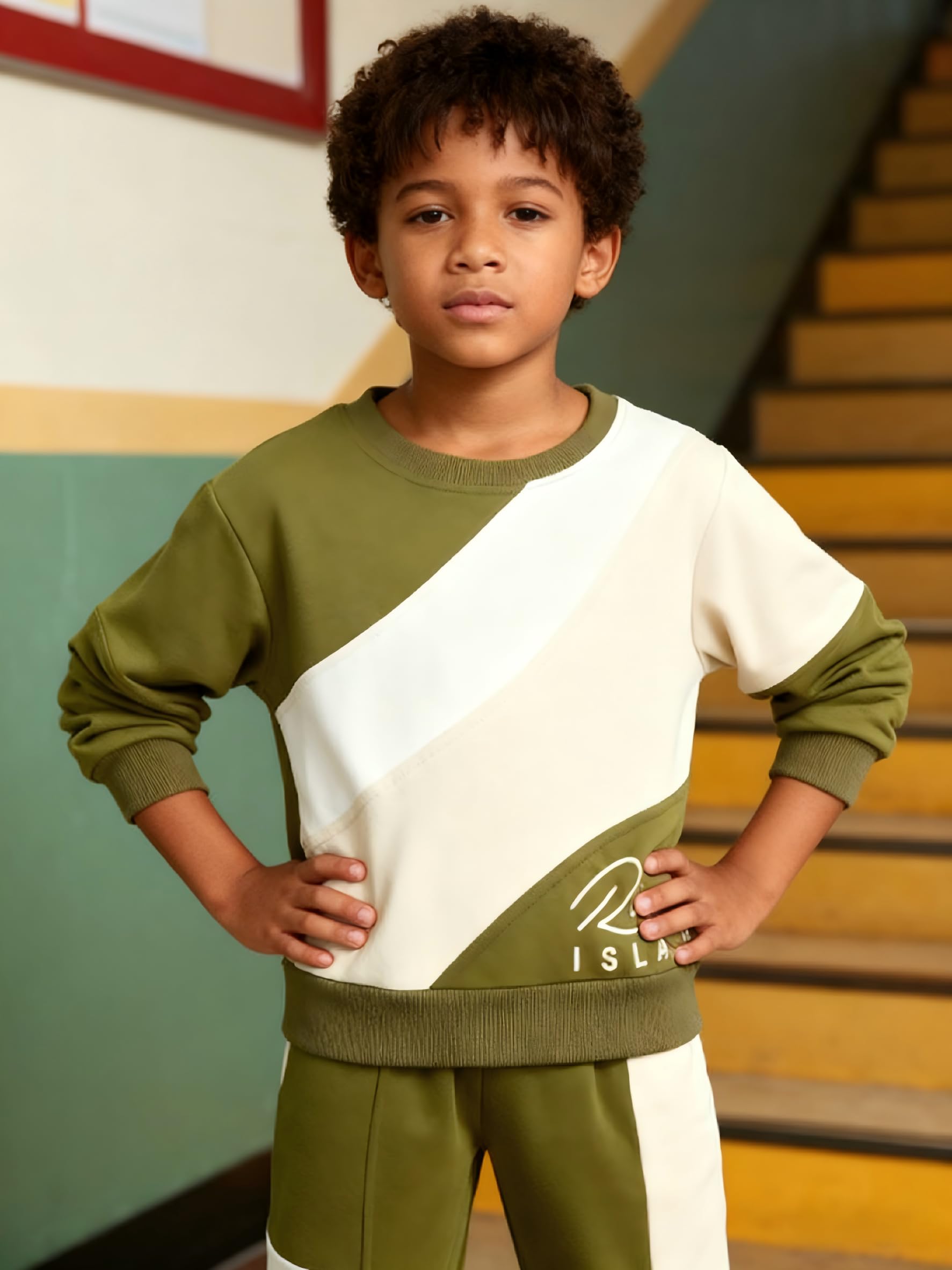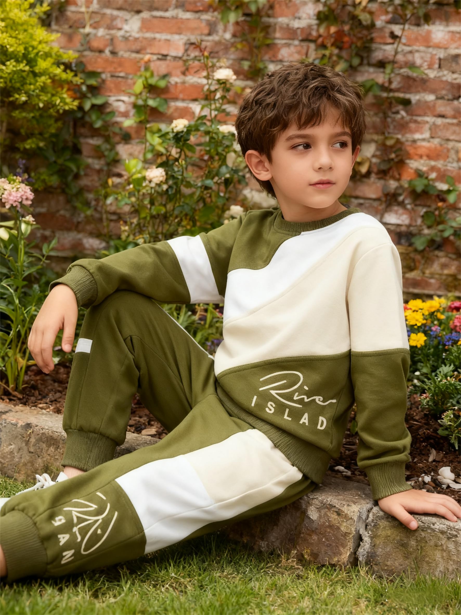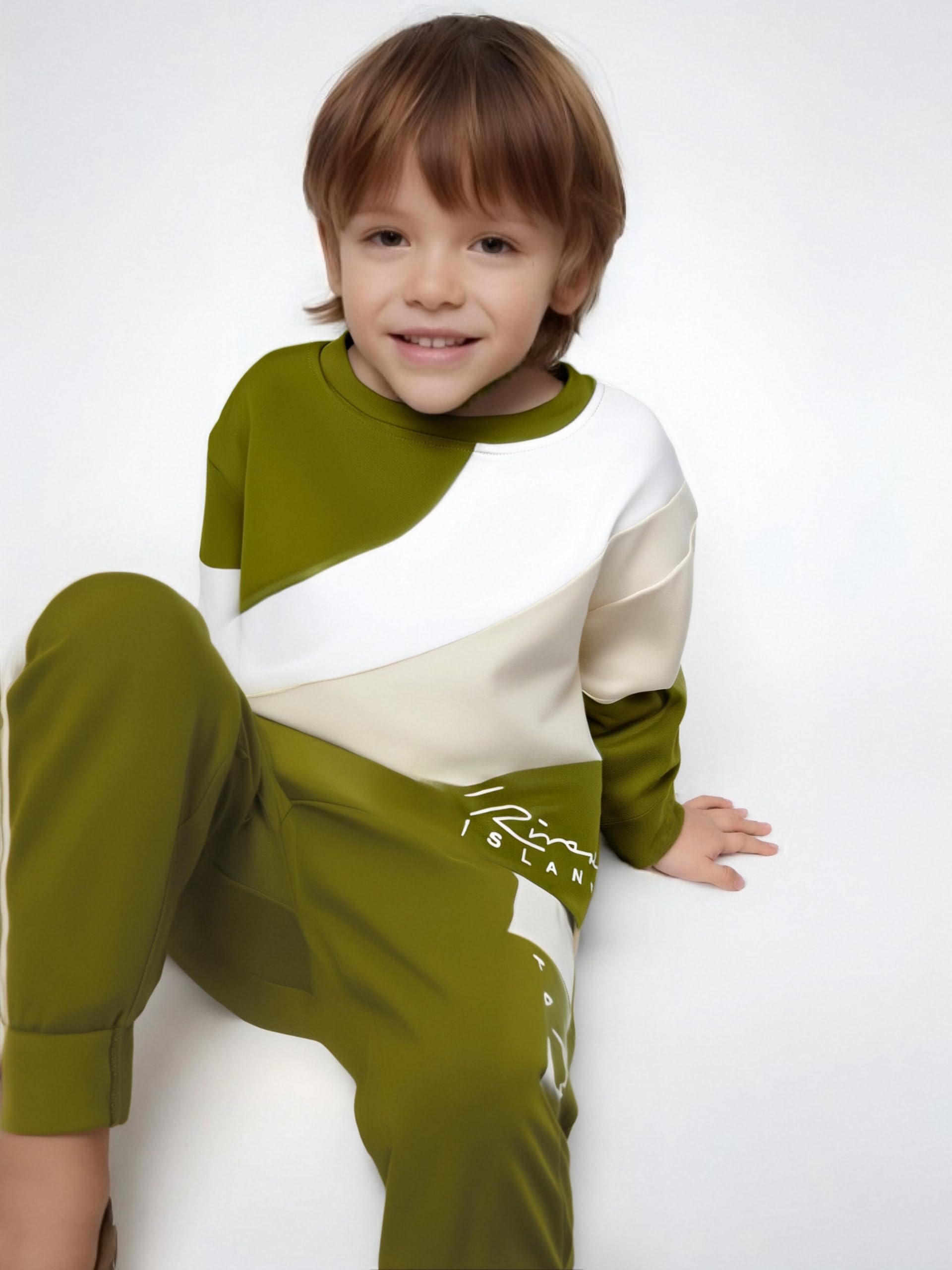 Design: Features a cool color - blocked design in olive, beige, and white. The top has an eye - catching diagonal color block pattern, and both the top and pants are printed with letter print for a trendy, coordinated look. Makes your boy stand out with a modern, sporty vibe.