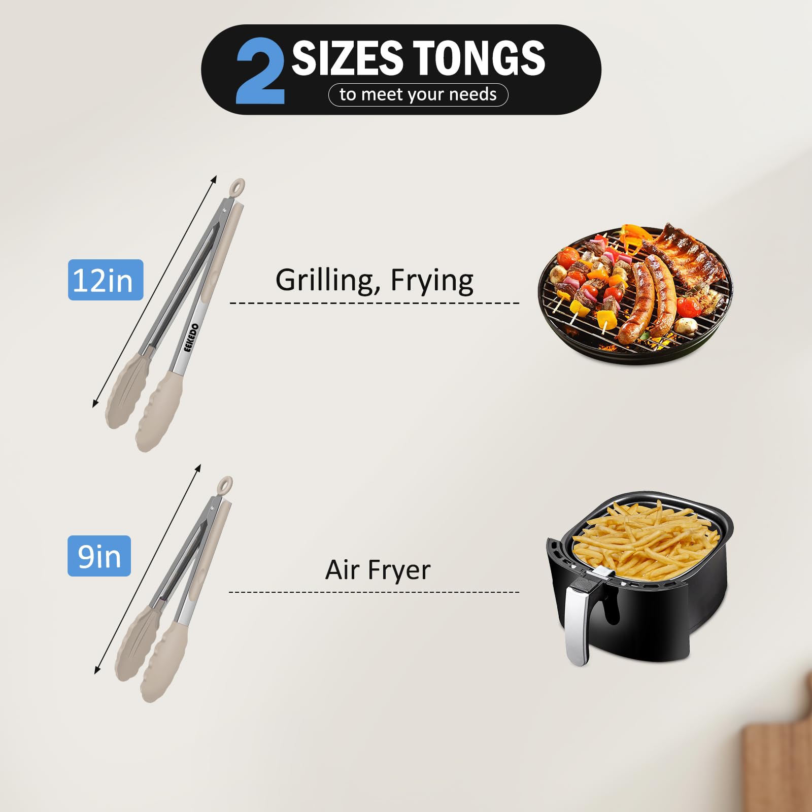 Essential Kitchen Tools: This tongs for cooking comes with 2 sizes, 9 inch and 12 inch. Perfect for your different kitchen tasks, indoor or outdoor use, grilling, flipping burgers/fish, cutting roast meat, pick up noodles and eggs, or used as BBQ turner or salad serving and much more.