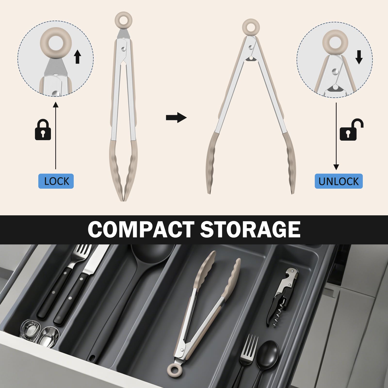 Locking Mechanism: This Cooking tongs have a ring pull locking mechanism, pull the ring for lock to save space, and push for open can be one-hand opration. Also include a hanging ring for easy hang and storage.