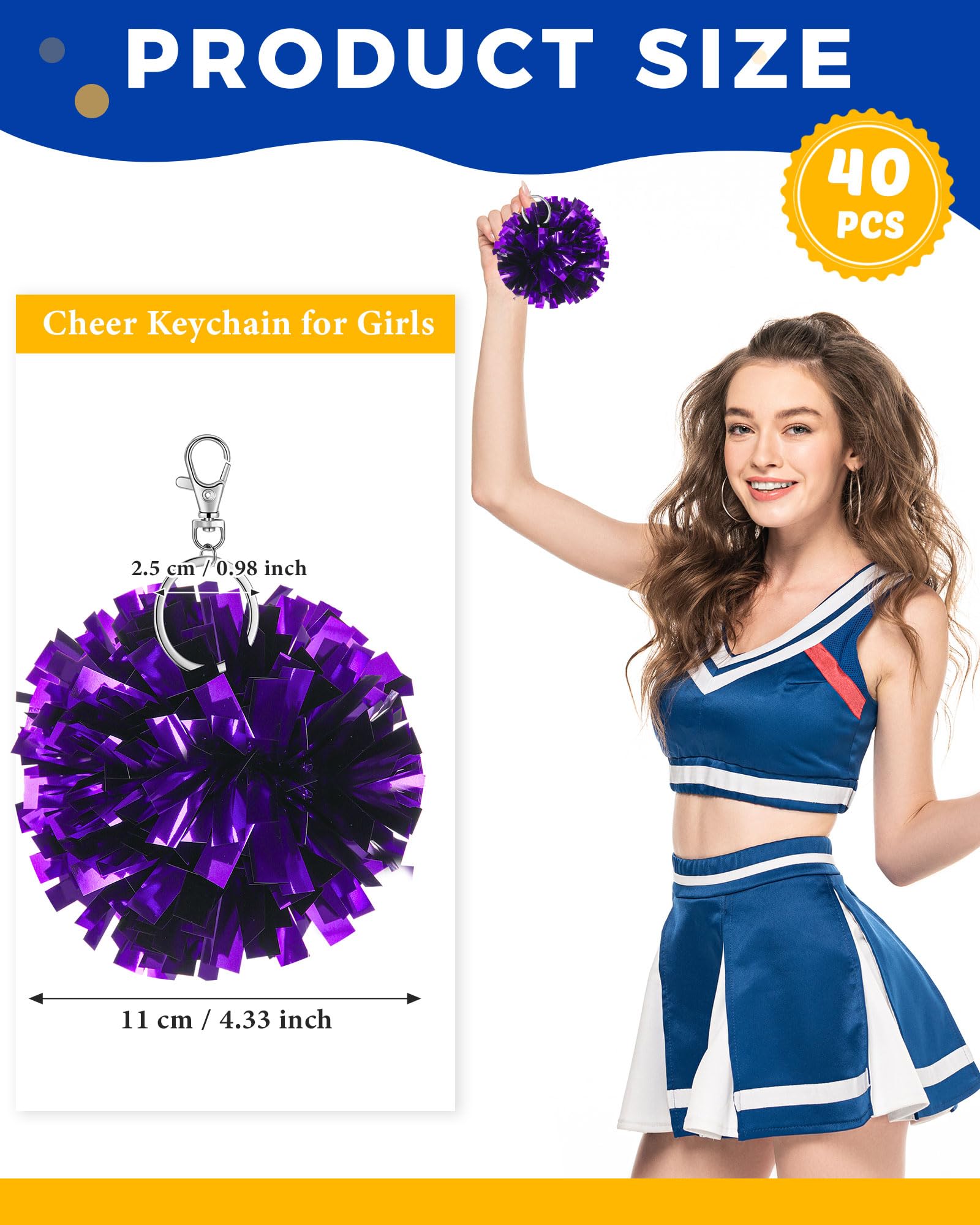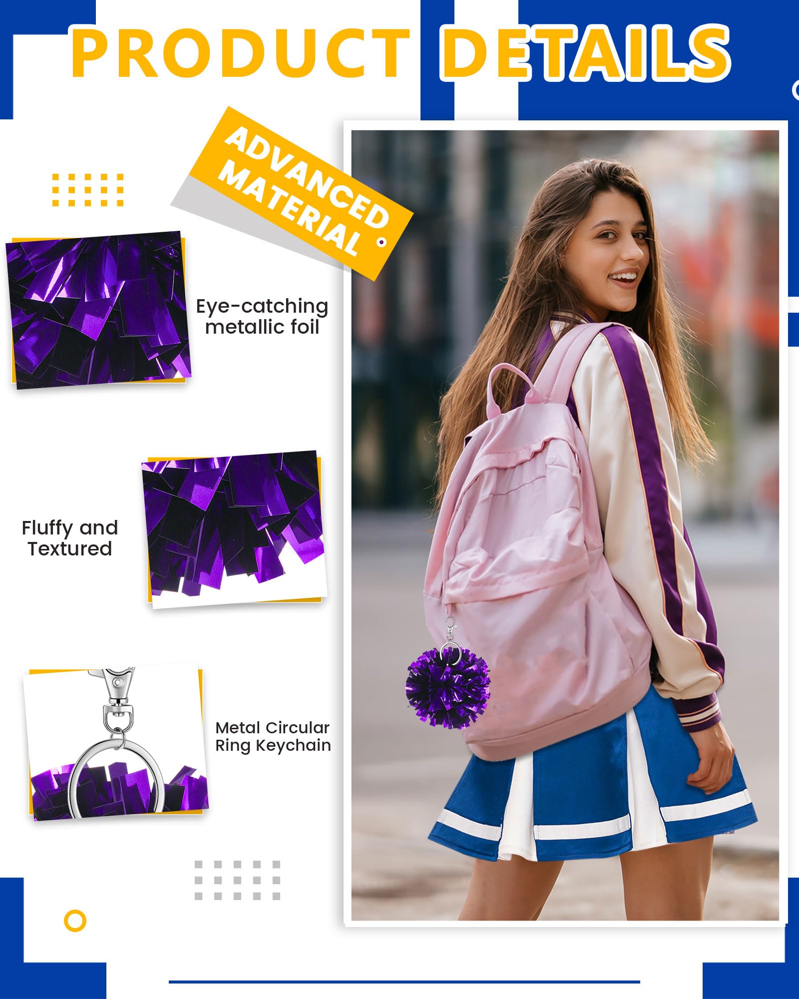 Sturdy Material and Vibrant Colors: these pom pom keychains are made of quality plastic and metal for durability, and feature nonfading, shimmering metallic purple foil; They catch the eye, boost cheerleading spirit, and show your strong support for the team