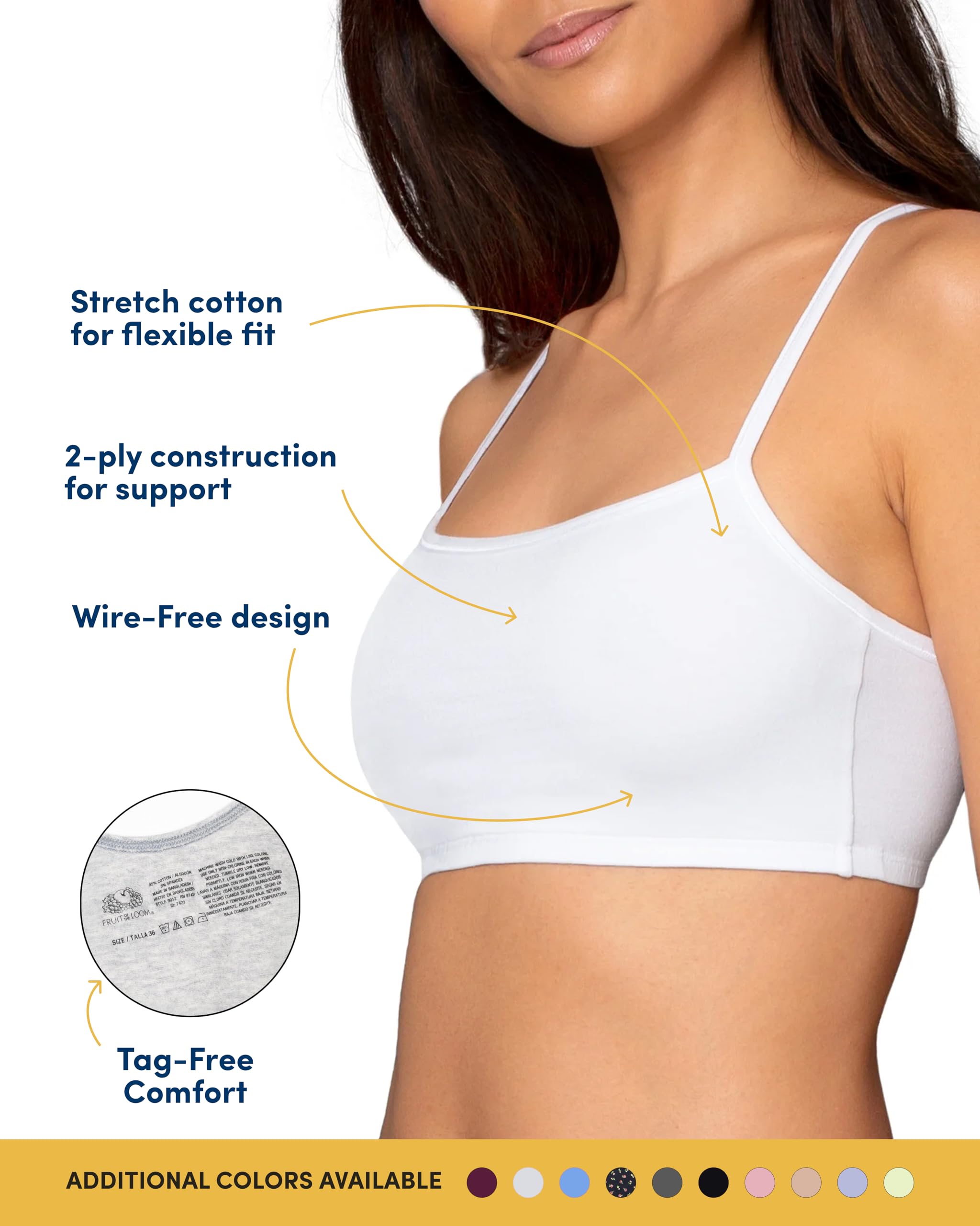 Description Designed with a full-coverage crop top neckline, the Fruit of the Loom Strappy Women's Sports Bra can be flaunted under shirts and takes for a cool flash of color. This great sport bra can be worn on it's own or layered for more color and support. An active lifestyle requires a brand that can give support and comfort. Fruit of the Loom has been a leader in affordable undergarments for more than 160 years. Our Unconditional Guarantee insures that you get the best product every time or your money back. So run, jump, bike, or sprint happy with Fruit of the Loom.