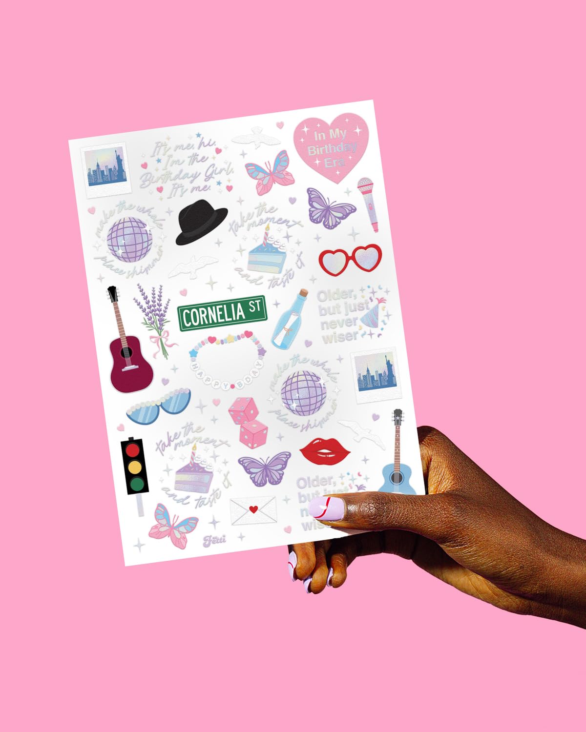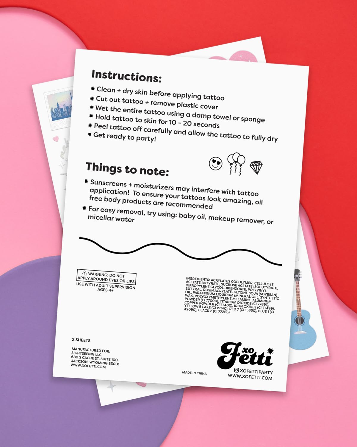 These temporary tattoos are a era's party must have. Not only are they super cute, but guests will love them too! With 50 full color and iridescent tattoos in total, every party girl will get their own. With designs like guitars, butterflies, 22 hat, lyrics + more there is sure to be a favorite for everyone. Ready to apply? Use our easy to follow instructions on the back of the tattoo sheet. Once applied, get ready to party day into night since these are long lasting, durable, and waterproof. So, are you ready to throw the coolest birthday or concert party of all time? We got you girl!