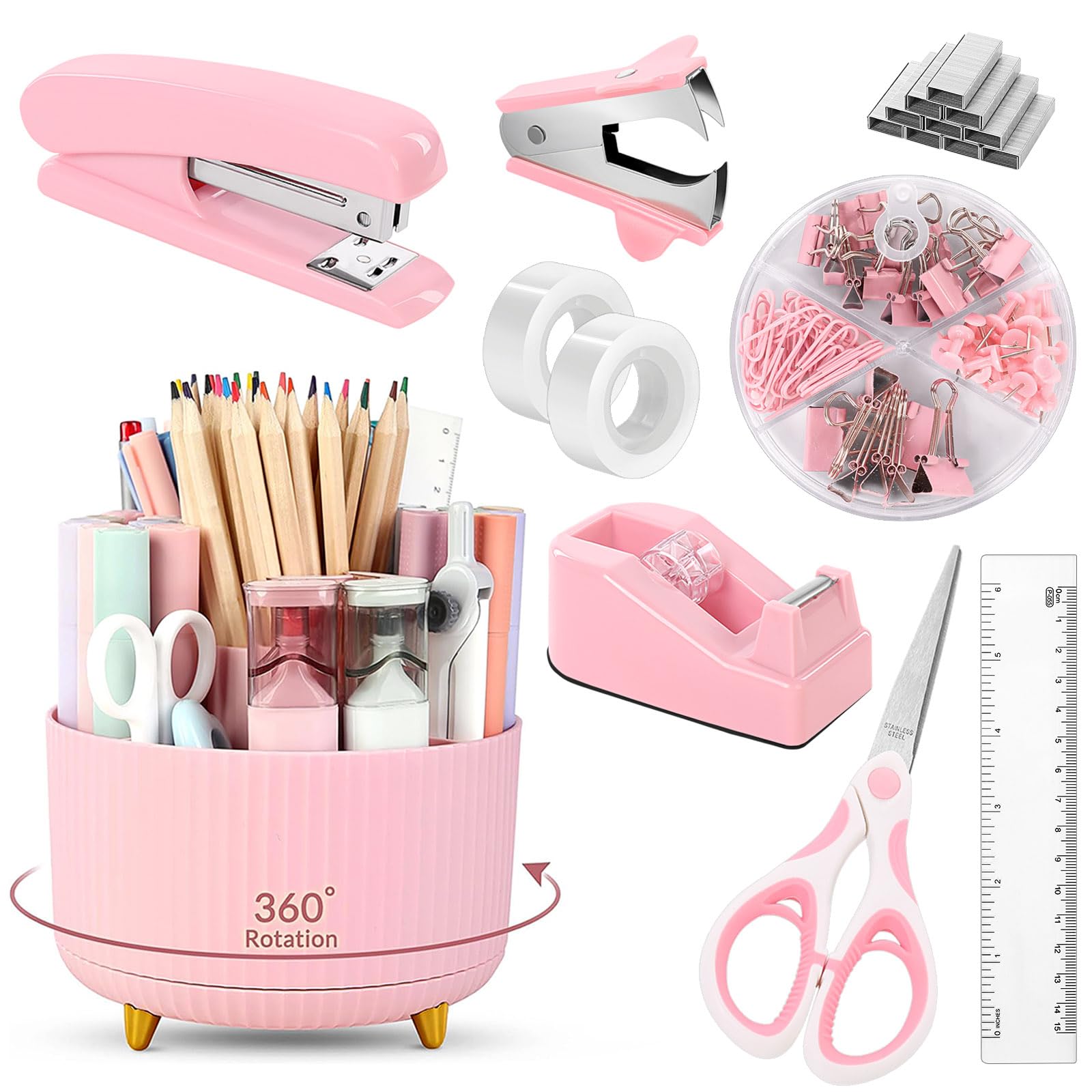 Desk Organizers and Accessories Set: Office Supplies set includes a variety of essential office items,1 x 360-degree rotating pen holders, 1 x staplers, 1 x staple removers, 1000 x staples, 1 x scissors,1 x rulers,1 x tape dispenser, binder clips & paper clips & push pins kit, 2 x tapes.This rich content make your workspace convenient and efficient.