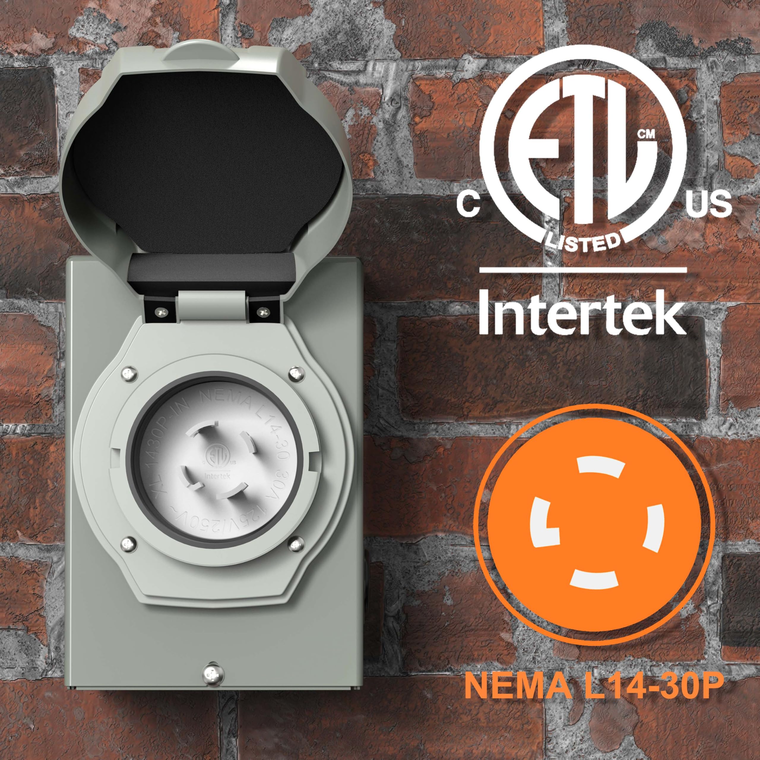 ETL Certified: 30 Amp, 125/250V, 7500W, NEAM L14-30 inlet generator plug, suit for all 30 amp NEMA L14-30 generator cord. Max wire Gauge:10 AWG. The best partner for the generator to the house power cord, ETL Certified